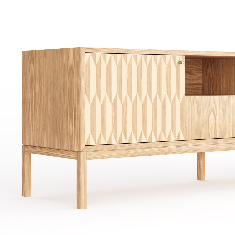 Oak long sideboard, TV stand with two inlaid doors and one drawer in mid century modern style, credenza, dresser, commode, media cabinet