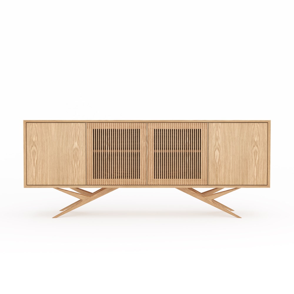 Oak long sideboard with four slatted doors and organic shape base in mid century modern style, highboard, commode, TV stand, dresser