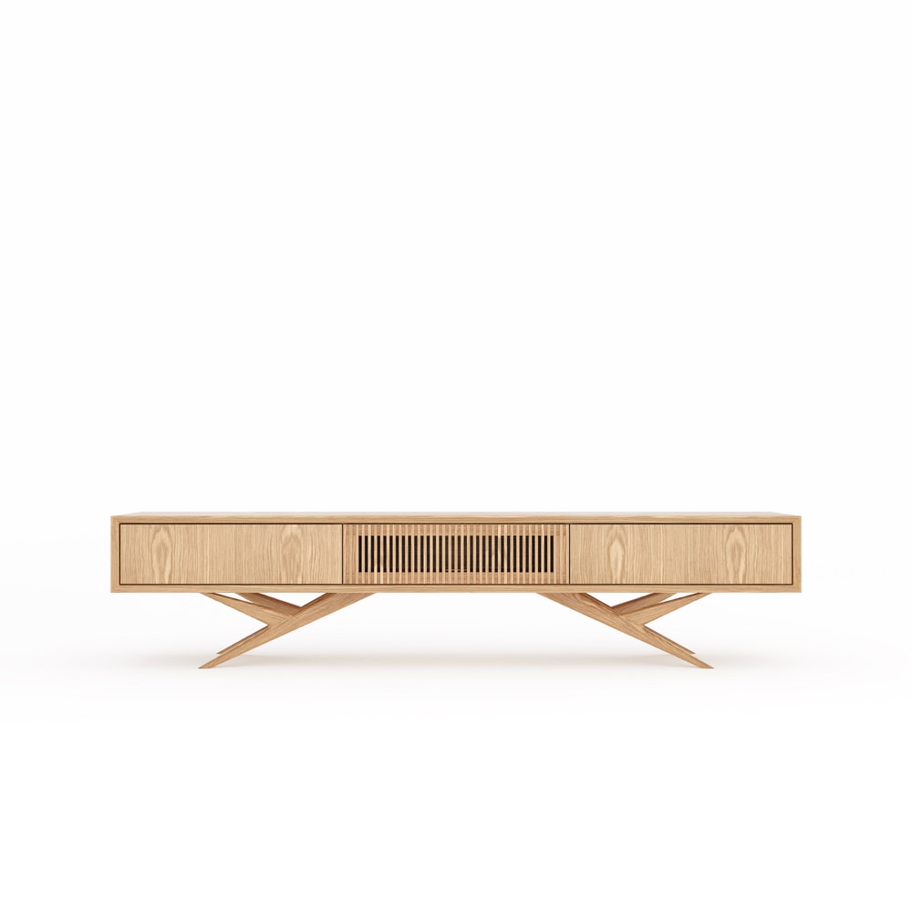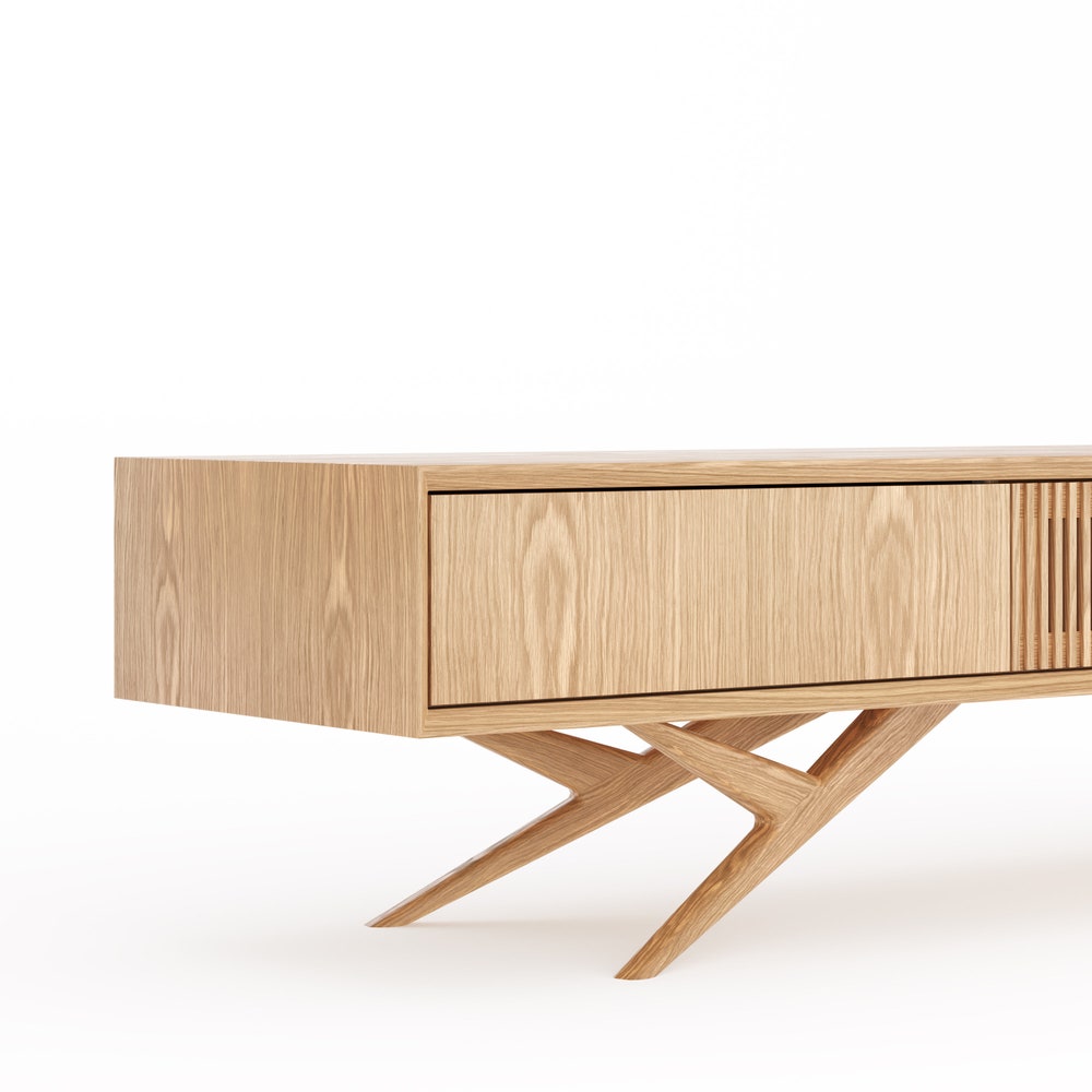 Oak long tv stand with slatted door, two drawers and organic shape base in mid century modern style, oak lowboard, media console center