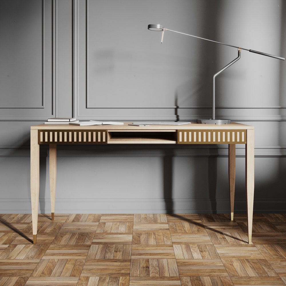 Oak office desk with two solid oak drawers and shelf with brass fronts, mid century modern, study desk, writing desk, solid oak desk