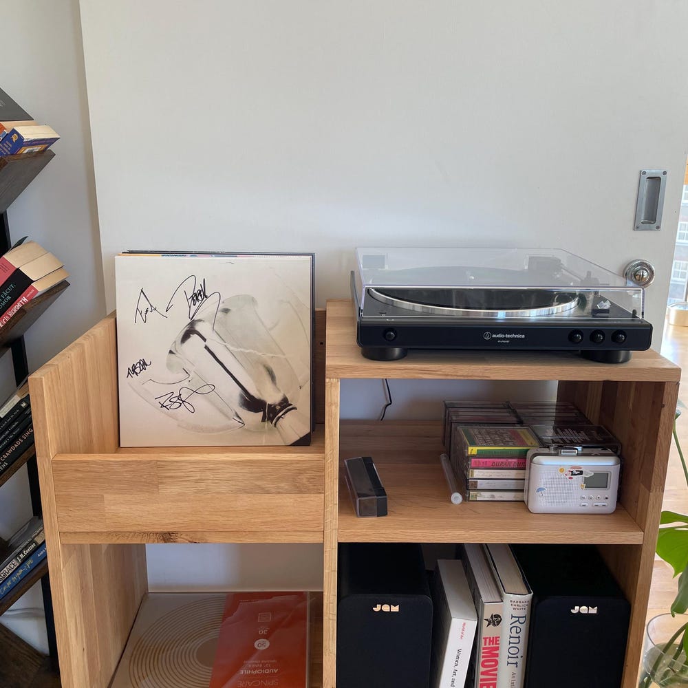 This turntable stand is meticulously crafted from 100% oak, showcasing our dedication to craftsmanship. We offer four wood options: pine, walnut, and birch plywood. You can see the wood options and color choices in the photos. We aim to bring quality and elegance to your home by translating our impeccable craftsmanship into furniture.