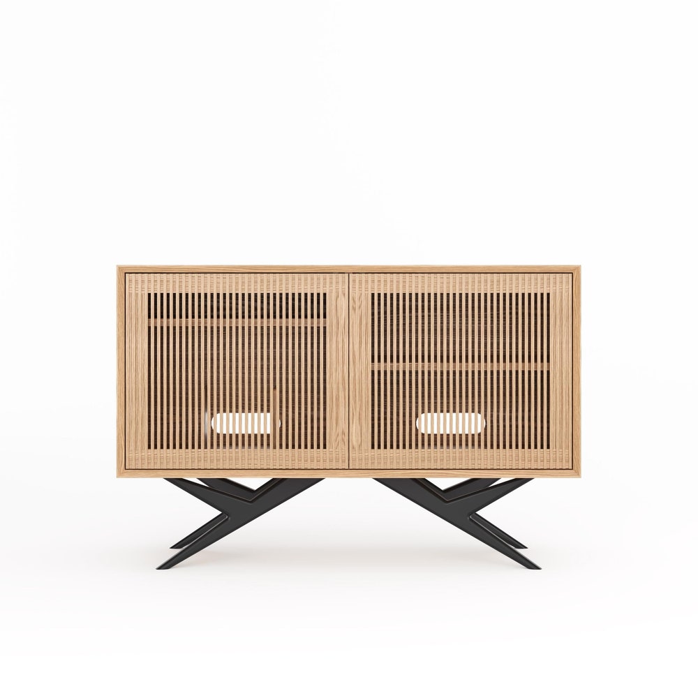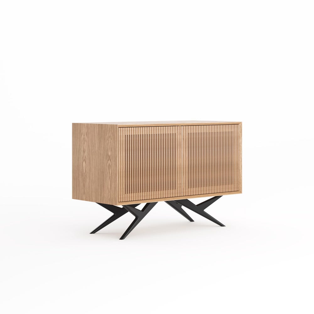 Oak record player stand with two slatted doors and black, aluminum, organic shape base in mid century modern style. The cabinet includes removable record dividers and adjustable shelves, allowing you to customize the storage space to accommodate media equipment and vinyl records. Cable holes in back + cutouts in shelves to allow for easy cable […]