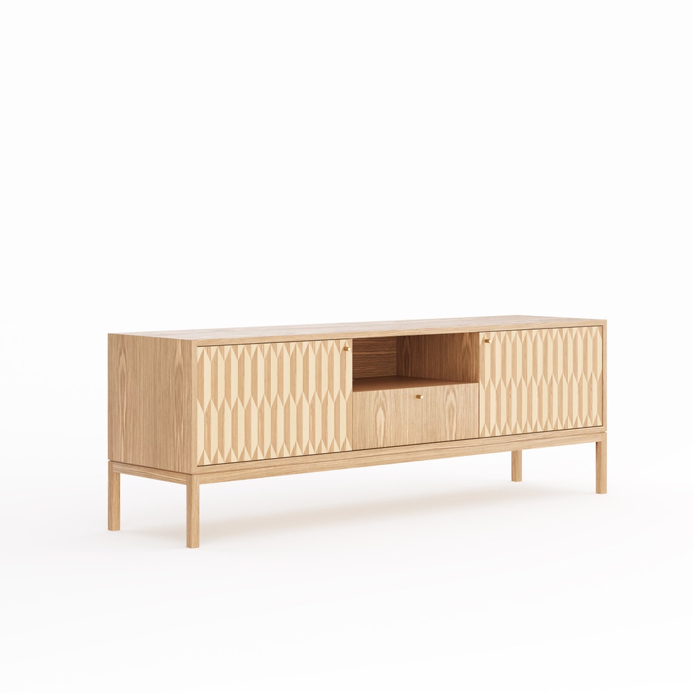 Beautiful oak sideboard, TV stand with two inlaid doors and one drawer in mid century modern style.Brass handles and cable hole in the middle.Doors are inlaid (oak + maple veneer).Sideboard, made of solid oak wood and wood covered with natural oak veneer. One adjustable shelf behind each door.Handmade in Poland. Dimensions:width: 150 cm or 180 […]