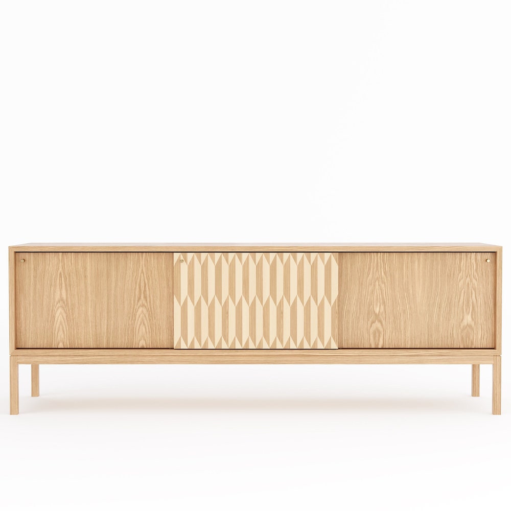 Oak sideboard with three inlaid sliding doors in mid century modern style, credenza, dresser, commode, made of oak veneer, oak + maple inlay