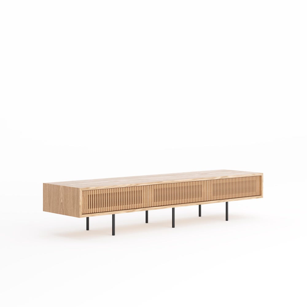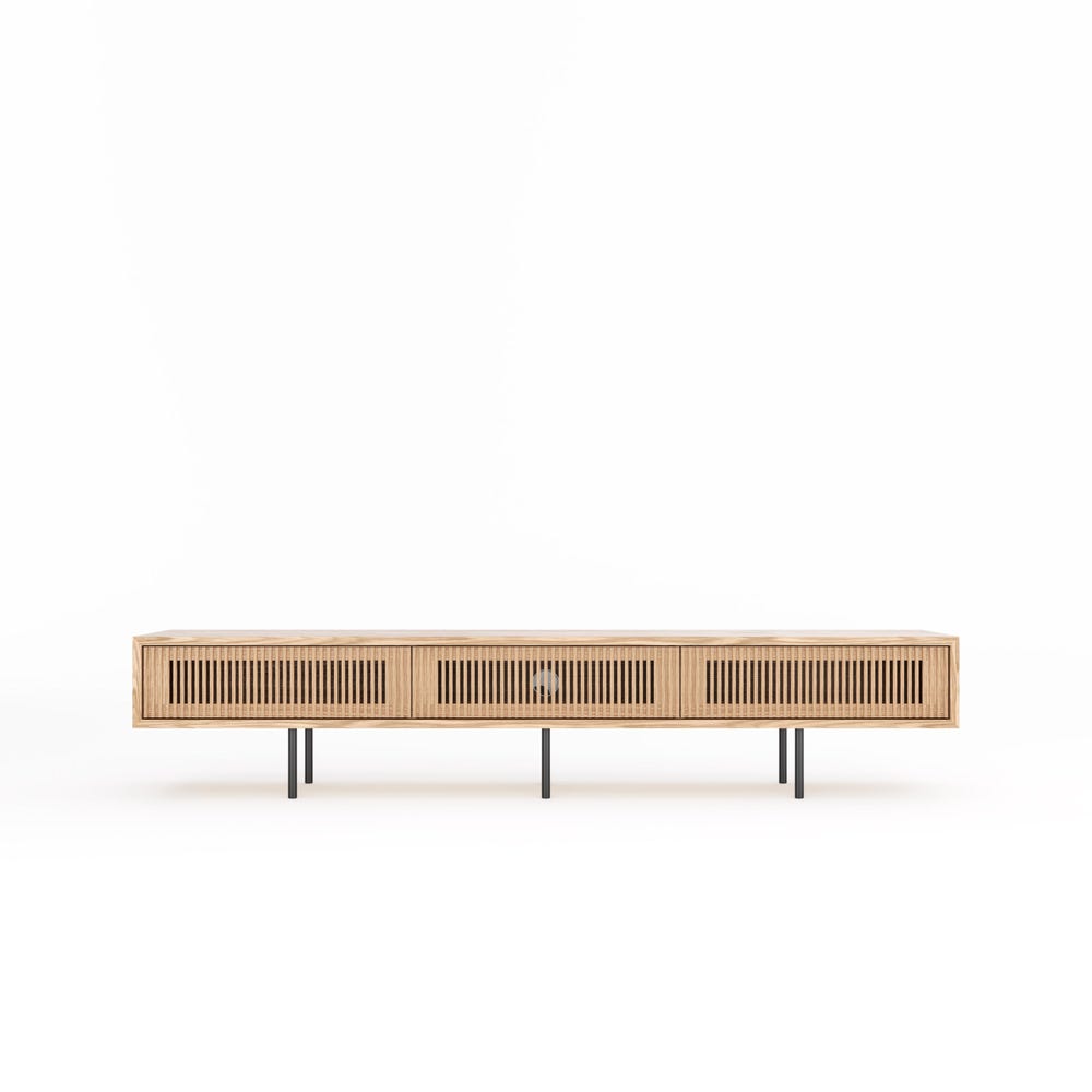 Oak lowboard with three slatted doors and simple aluminum black legs in mid century modern style.