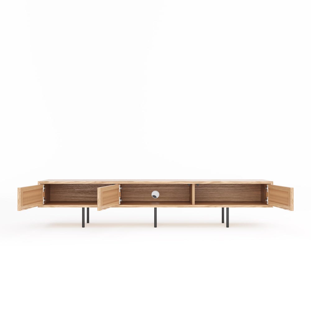Cable hole behind middle slatted door + holes in the compartments to allow for easy cable routing. Six straight, black lacquered aluminum legs.