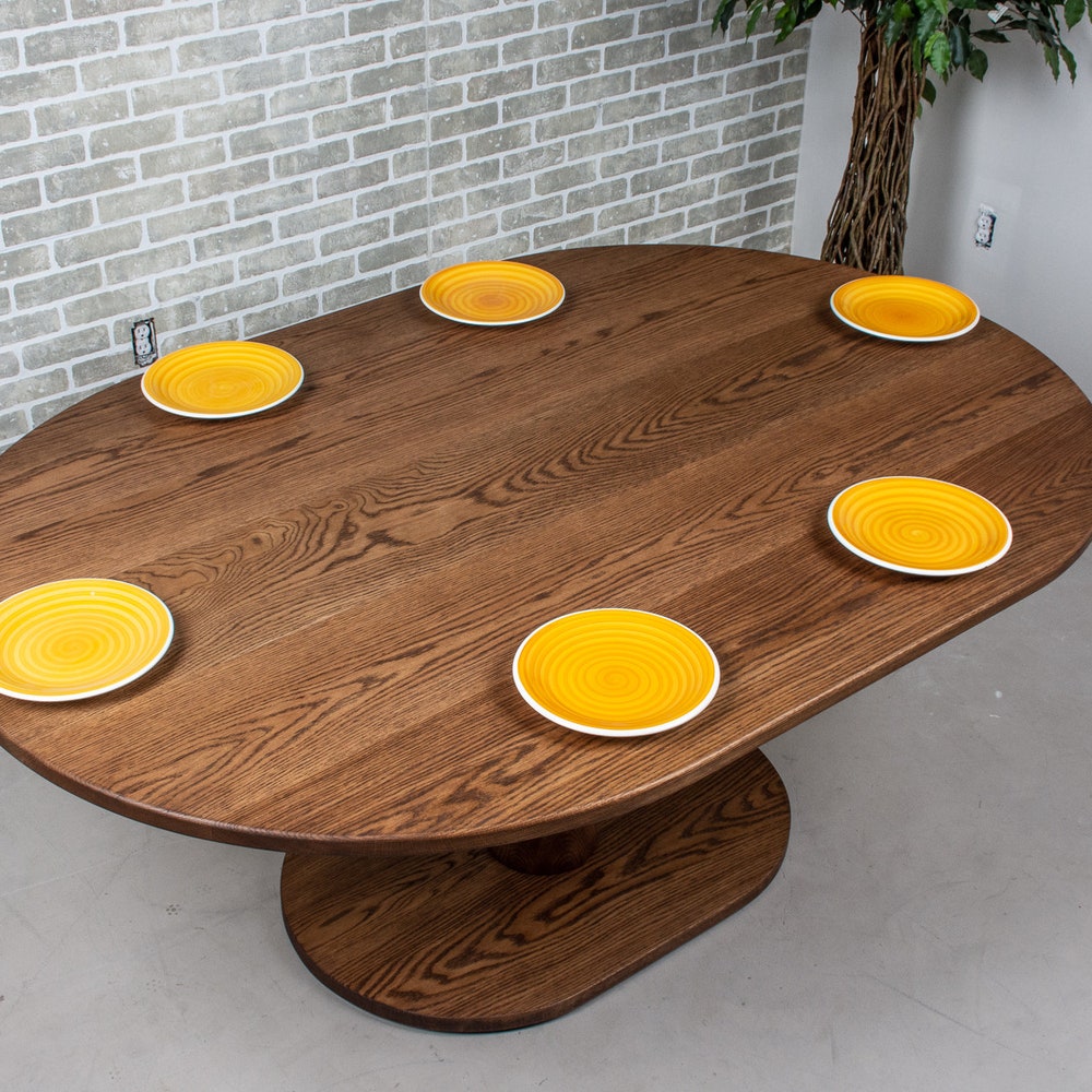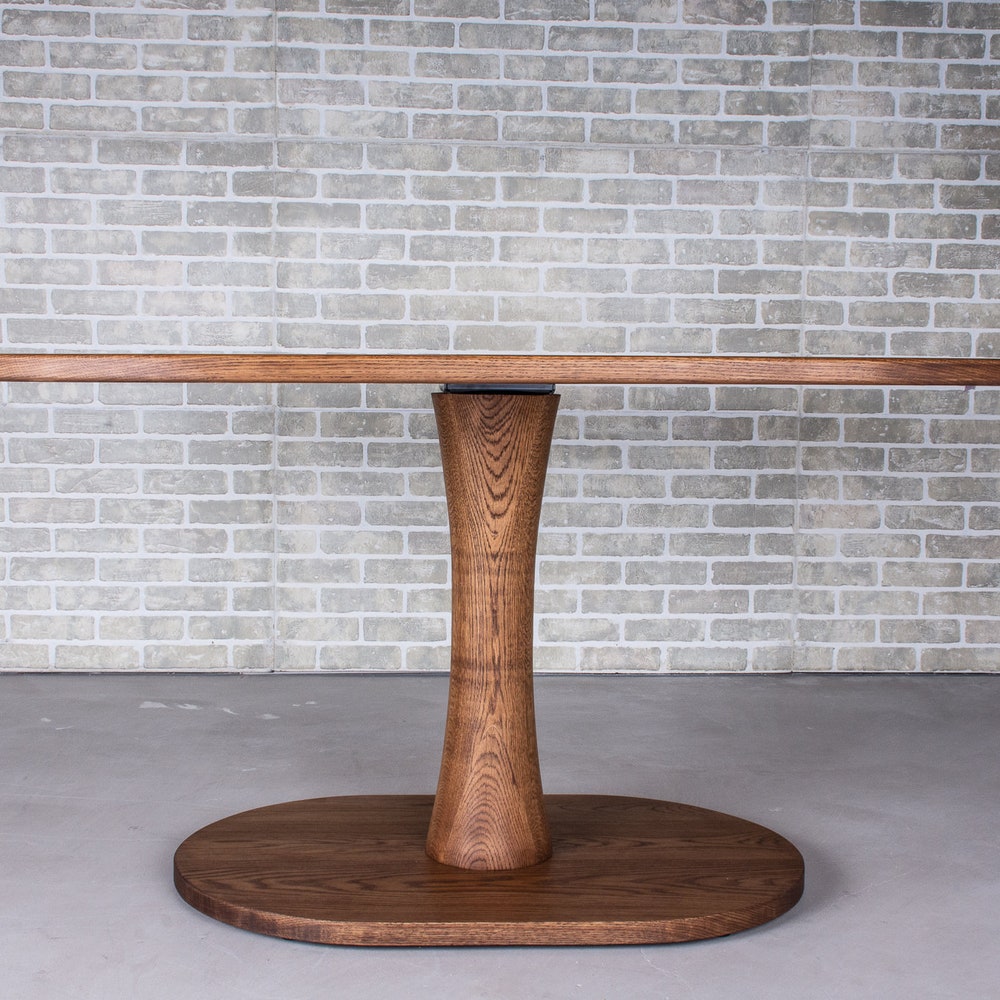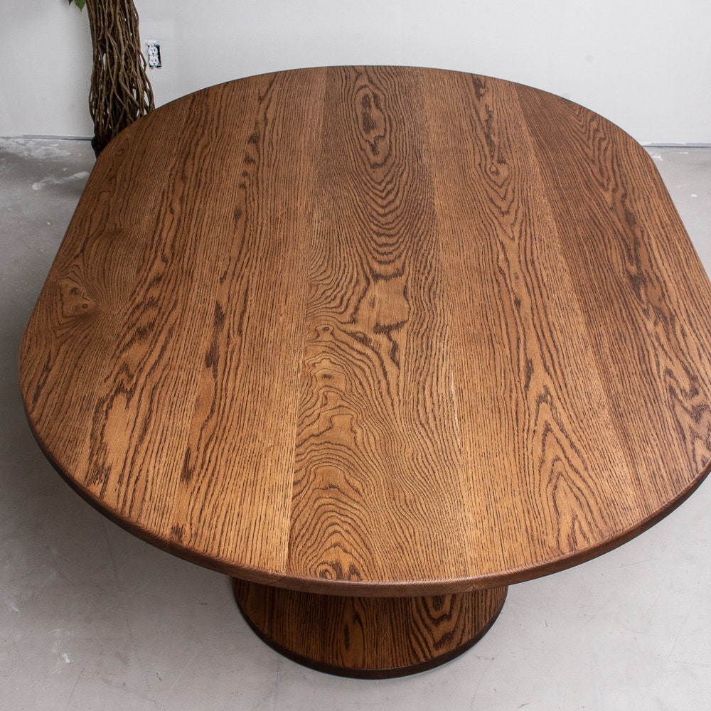 Add warmth to your kitchen dining space with the rich tones of this oak oval dining table. The oval pedestal table is perfect for a banquette or small dining space because of the space under the table for legs. We build every table to order so there are many ways to make this table perfect for you.