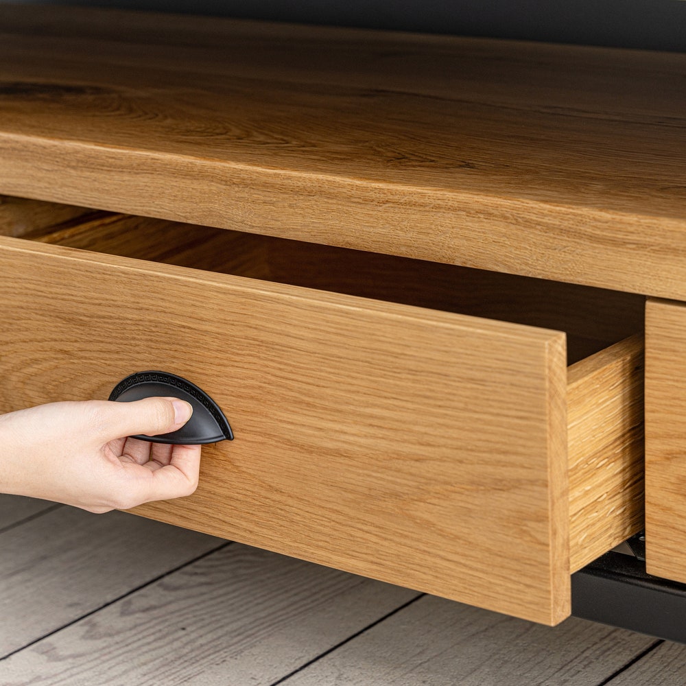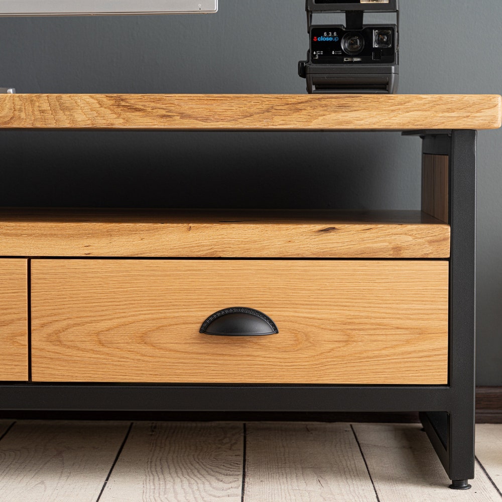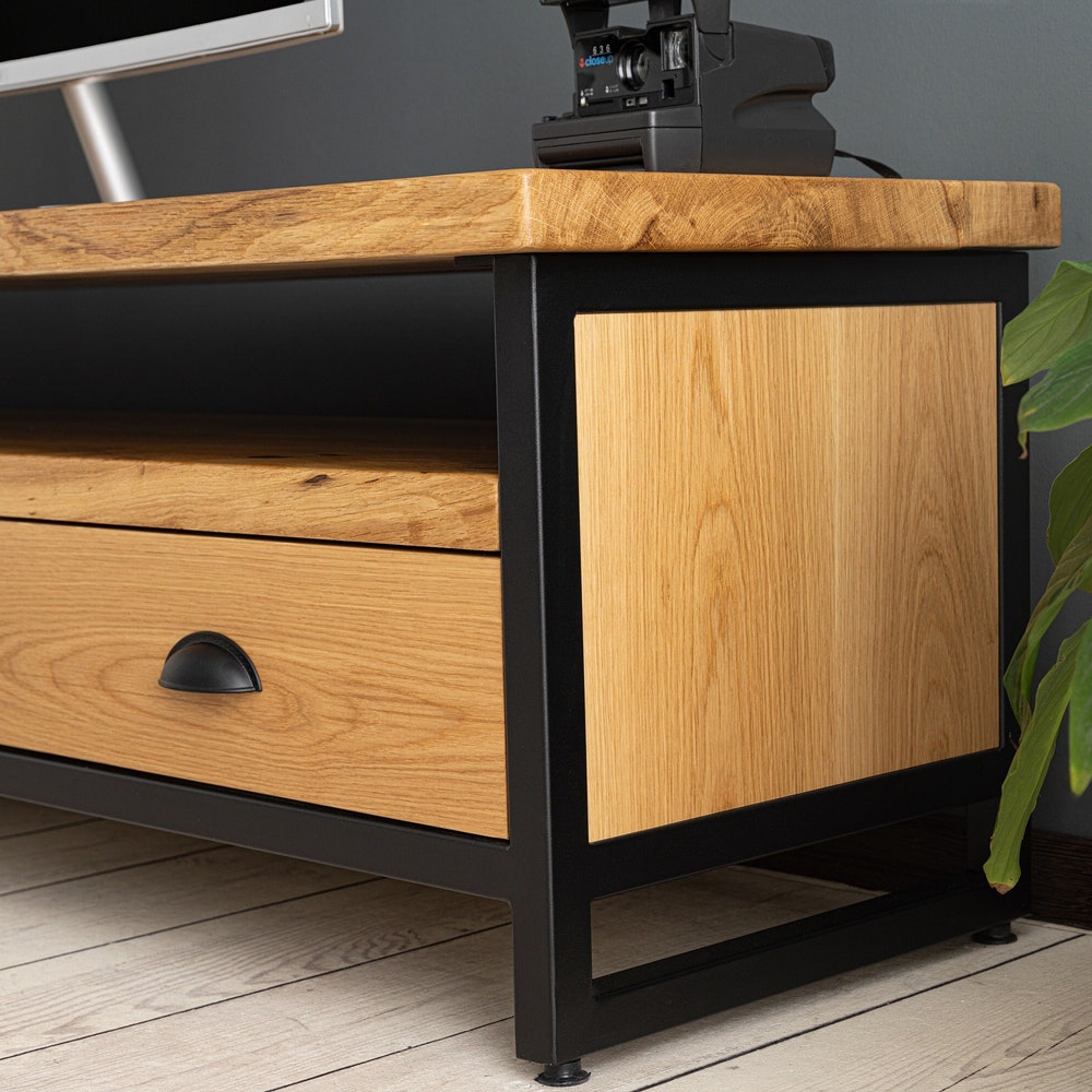 This is a piece of natural luxury Console Tables industrial for Your home. Made completely from solid Oak. Drawer tv unit is treated with natural Oil to highlight the wood and its pattern. Oak is considered one of the strongest woods in nature with beautiful light beams in its pattern. The front face of the Farmhouse console is different for each product due to different wood patterns. Perfect for a home setting or as an office piece.A mid-century tv stand ideal for a modern, eclectic and traditional interior. the metal media console enriches interior providing warmth and light with a touch of the modern approach The piece is just as practical as it is beautiful.