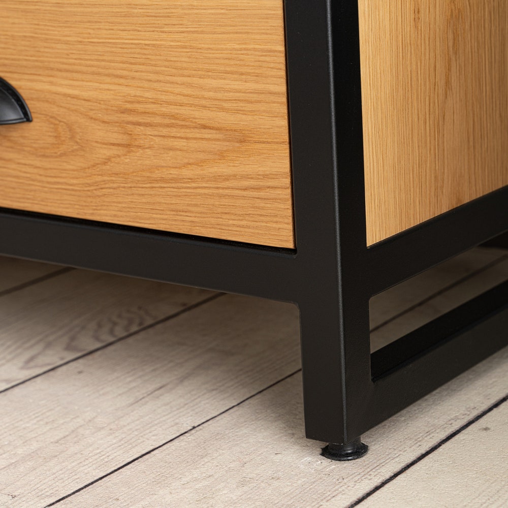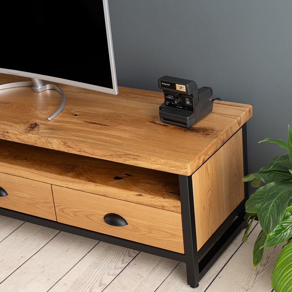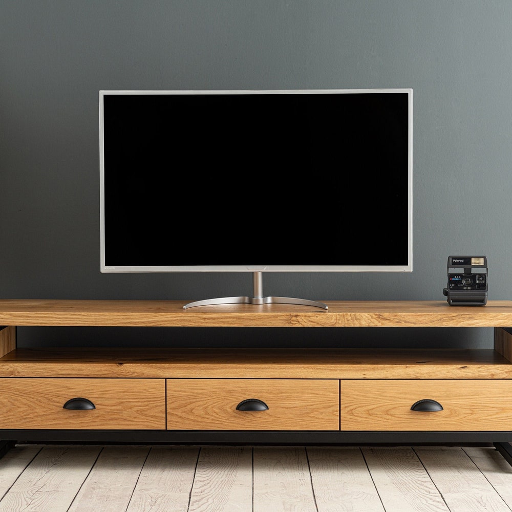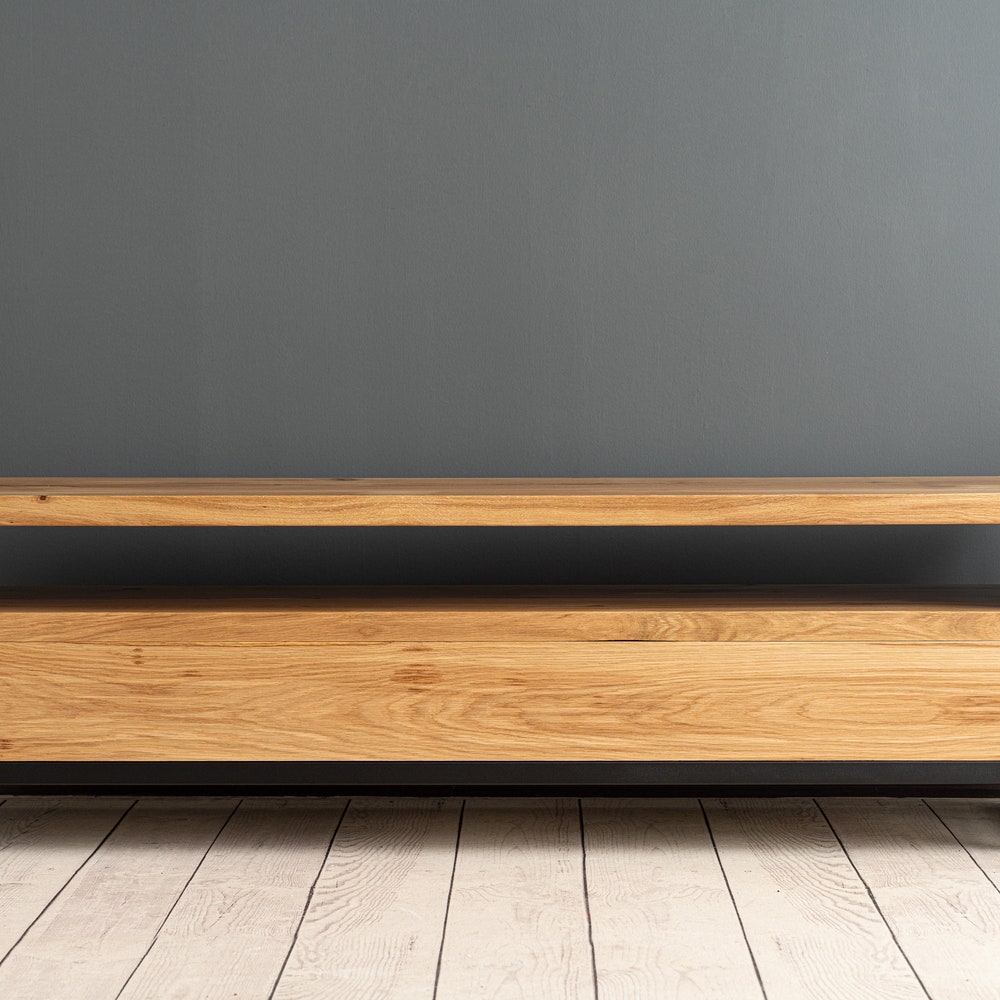 This is a piece of natural luxury Console Tables industrial for Your home. Made completely from solid Oak. Drawer tv unit is treated with natural Oil to highlight the wood and its pattern. Oak is considered one of the strongest woods in nature with beautiful light beams in its pattern. The front face of the Farmhouse console is different for each product due to different wood patterns. Perfect for a home setting or as an office piece.A mid-century tv stand ideal for a modern, eclectic and traditional interior. the metal media console enriches interior providing warmth and light with a touch of the modern approach The piece is just as practical as it is beautiful.
