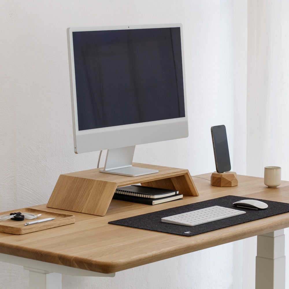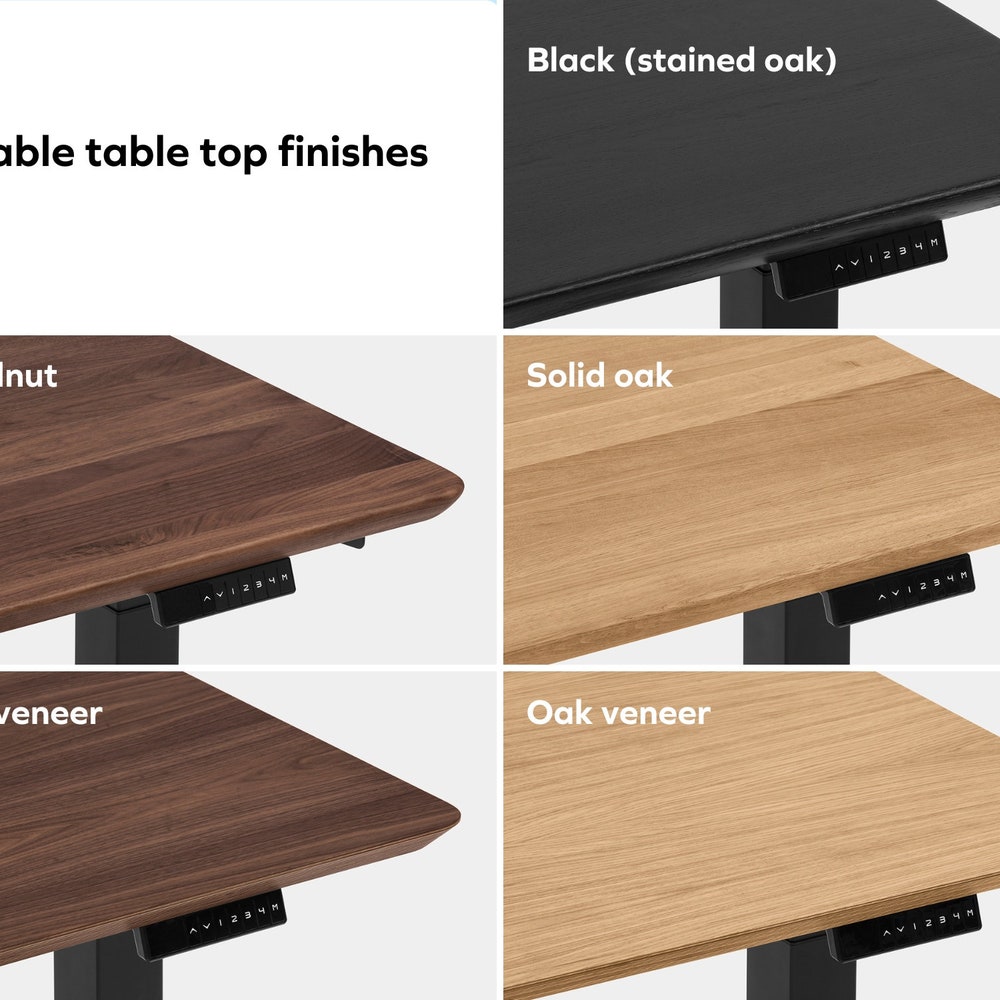 The table top of our standing desk is an ideal work surface – handcrafted in solid oak or walnut wood, hand-polished, and covered with natural oil wax. Working with wood is our passion – that’s why every standing desk is designed and manufactured in our workshop. A solid 42 mm (1.7”) table top covered with oil-wax with a matte finish has visible wood grains.