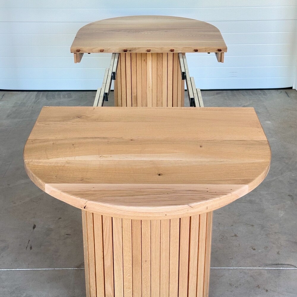 An oblong extension table featuring two fluted pedestal bases and a quartersawn curved apron that complements the shape of both the top and base. A mid century, modern appeal.