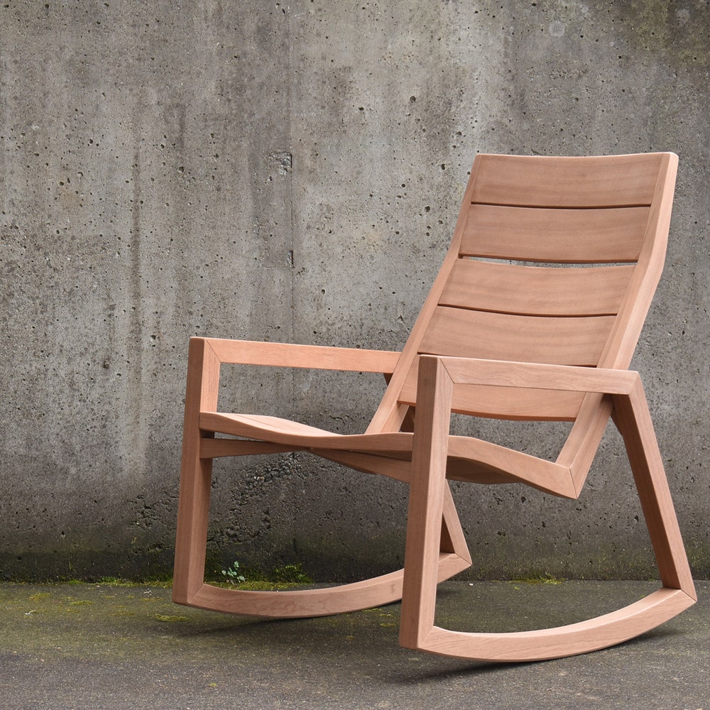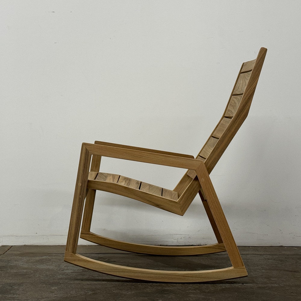 Modern / contemporary rocking chair made in solid teak or mahogany. Designed to complement a variety of architectural styles – works with traditional/transitional and modern/contemporary outdoor spaces. Perfect addition to any poolside, deck, patio, or porch.
