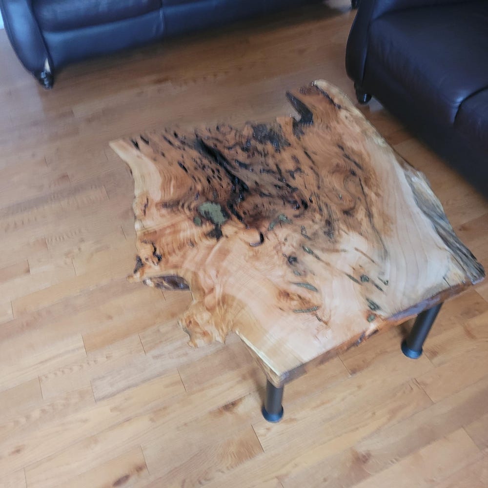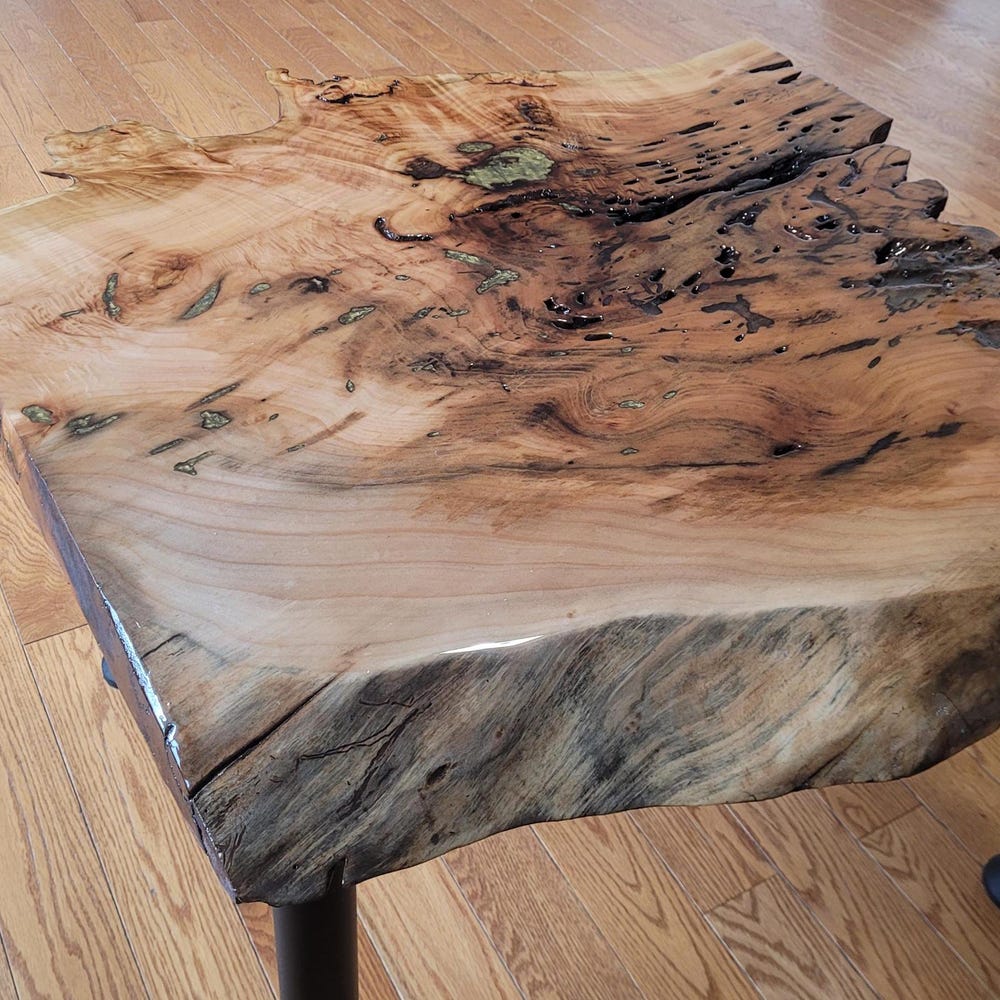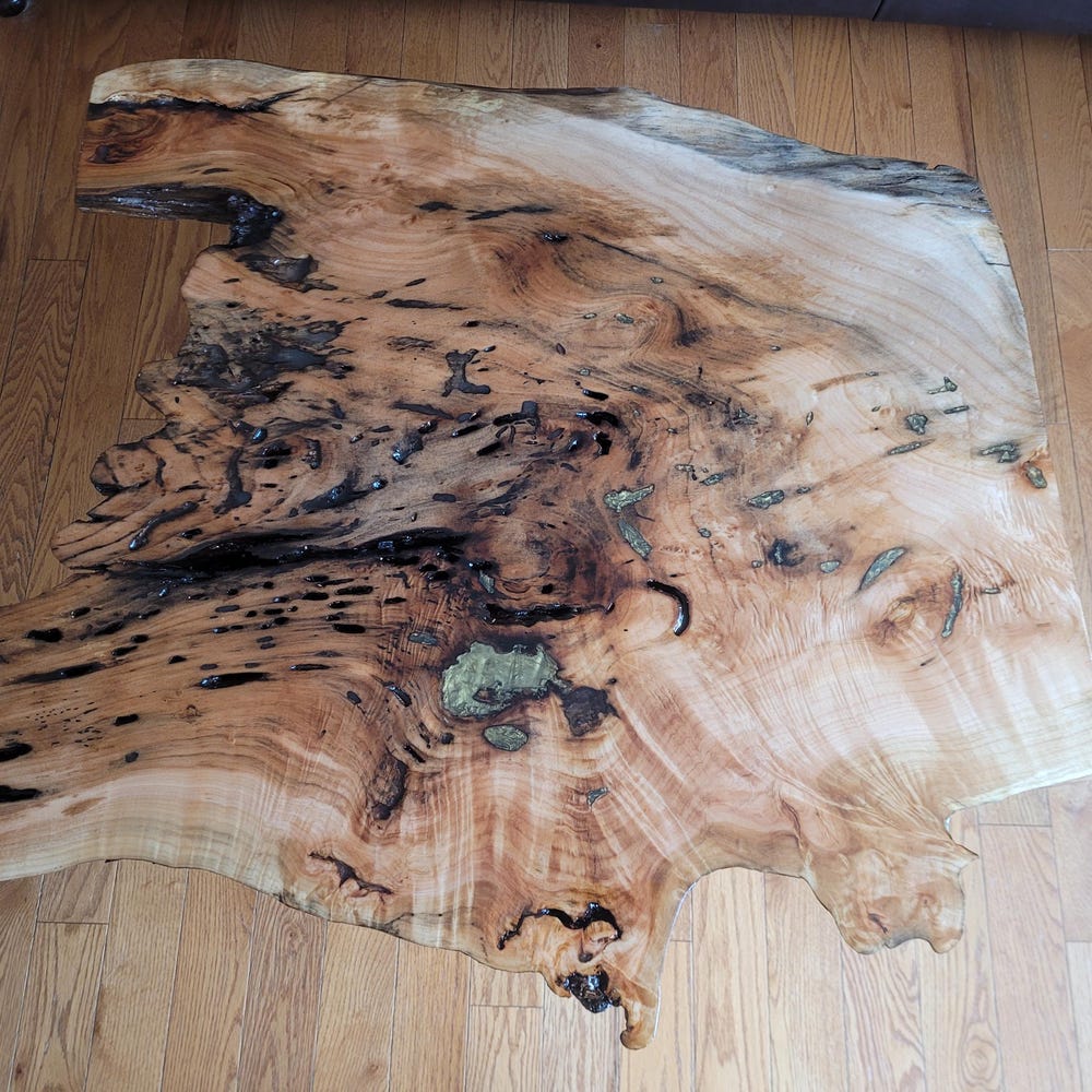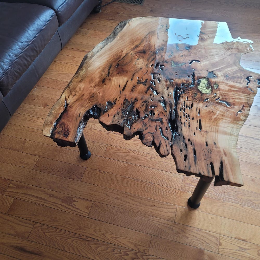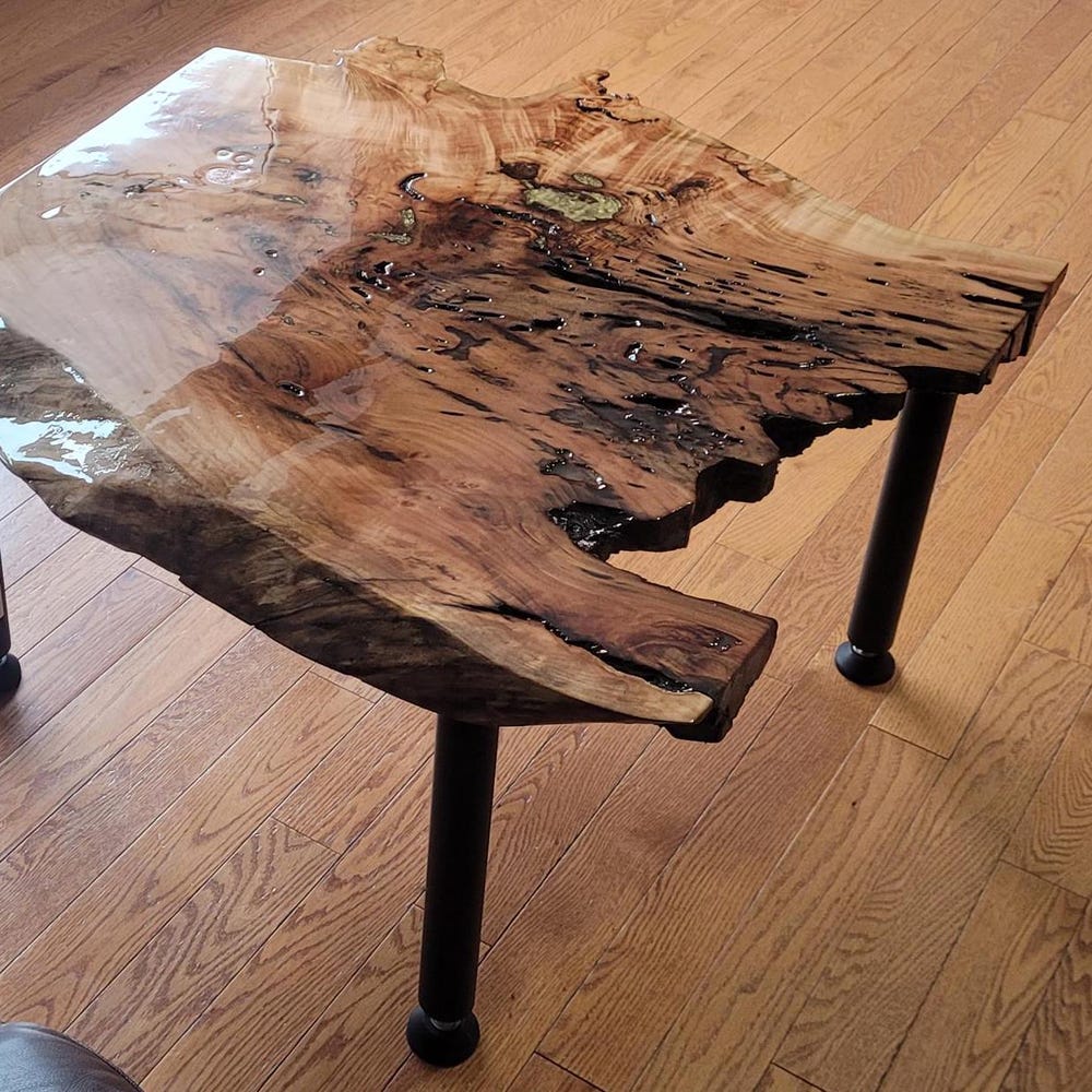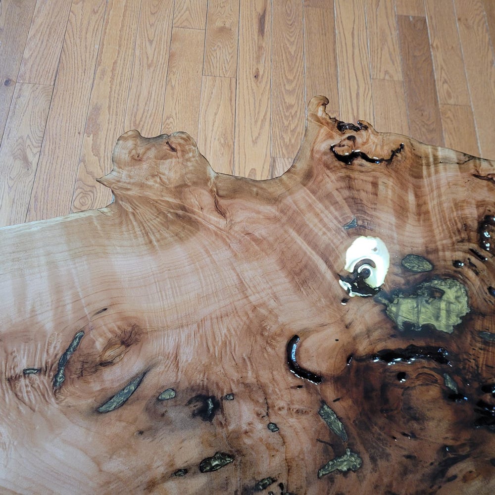 Elevate your home with this truly unique live-edge willow table, a striking fusion of raw nature and artistic craftsmanship. The organic shape and rich wood grain are accentuated by shimmering gold fleck epoxy, creating a sophisticated yet natural aesthetic. Handcrafted with care, this one-of-a-kind piece is more than just furniture—it’s a statement of artistry and individuality.