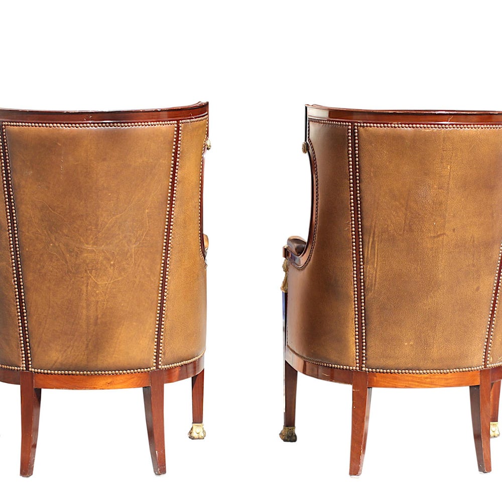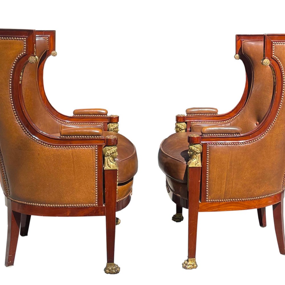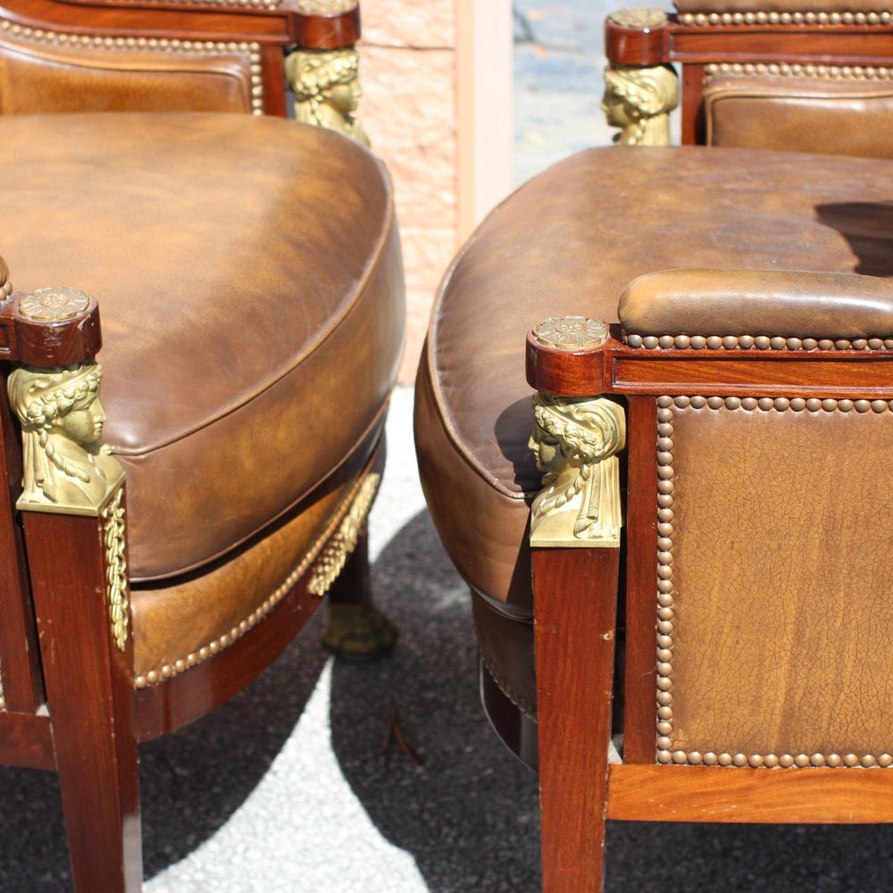 Each chair features a tufted brown leather backrest and shaped loose seat cushion, framed by molded mahogany rails adorned with gilt bronze mounts. Delicately cast female-headed masks and foliate details bring a regal touch to the arm supports and seat rails. The sculptural legs are capped with bronze claw feet, further emphasizing the chairs’ opulent style.