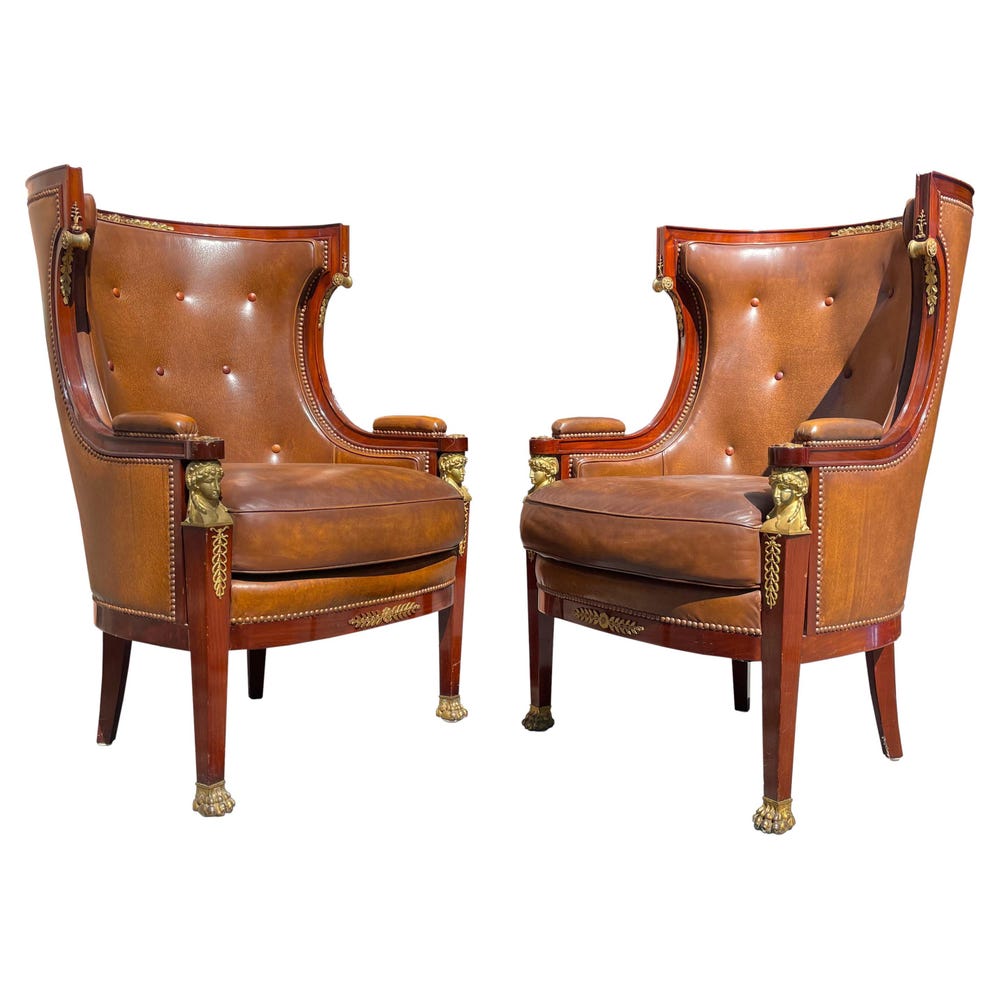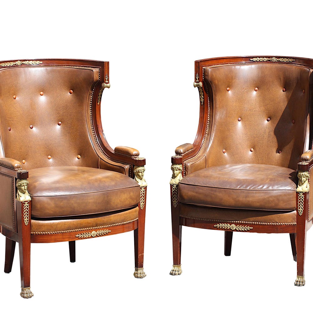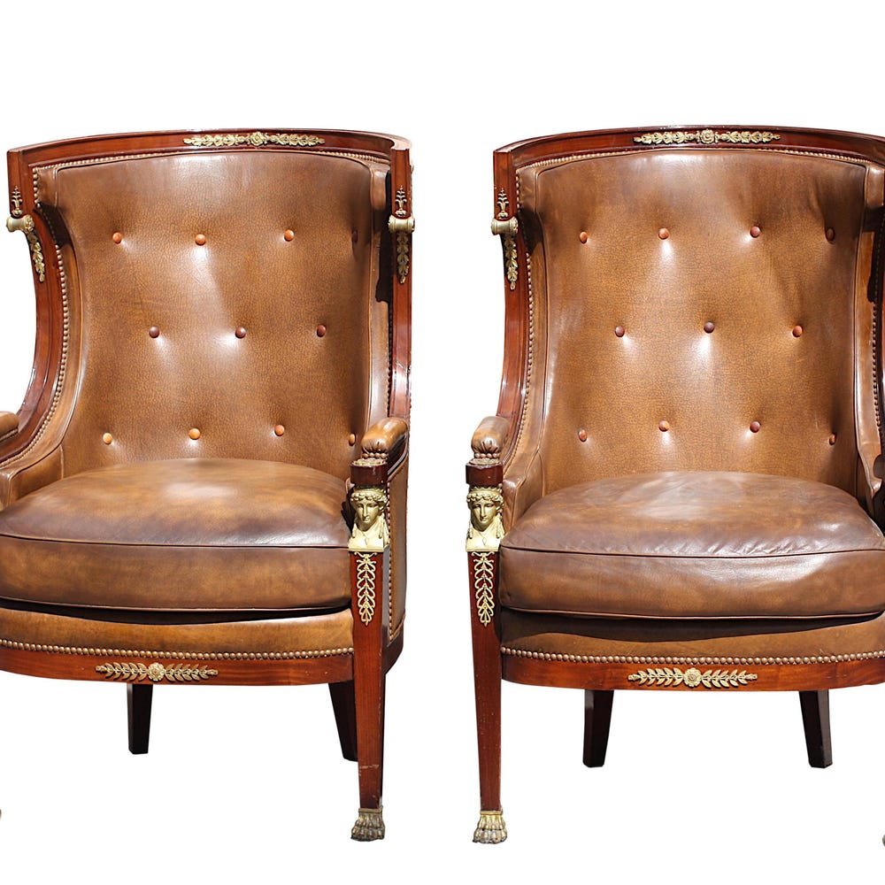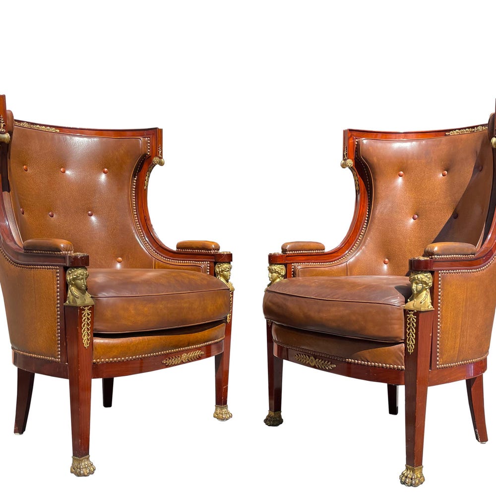Pair of Empire Style Leather-Upholstered Gilt Bronze Bergères – French Elegance, Circa 1900