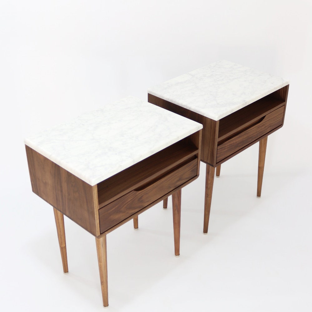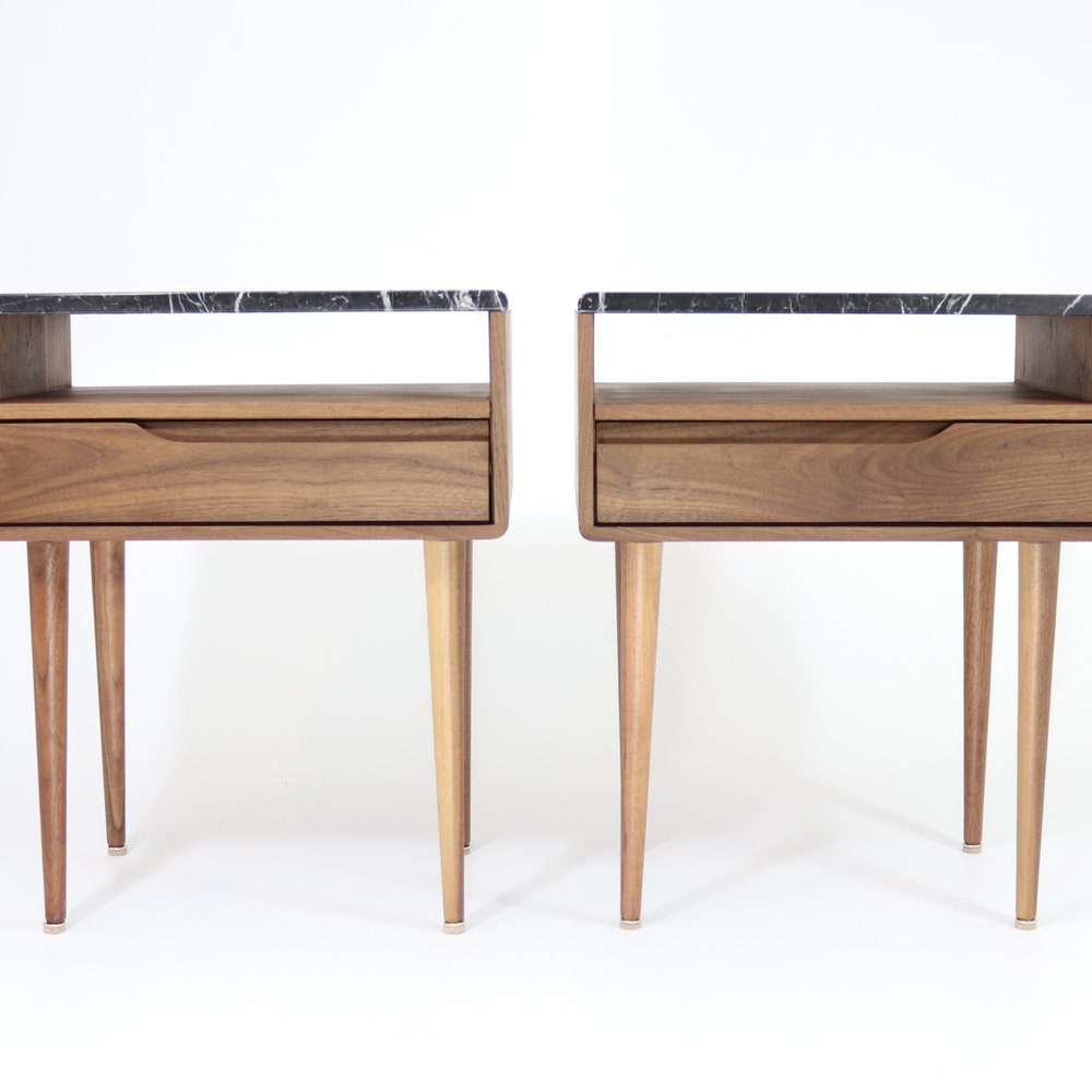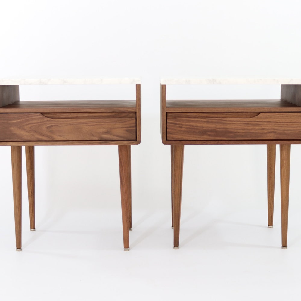 Pair Nightstand, Bedside table, Side table with marble top, shelf and lower drawer in solid Oak or Walnut.