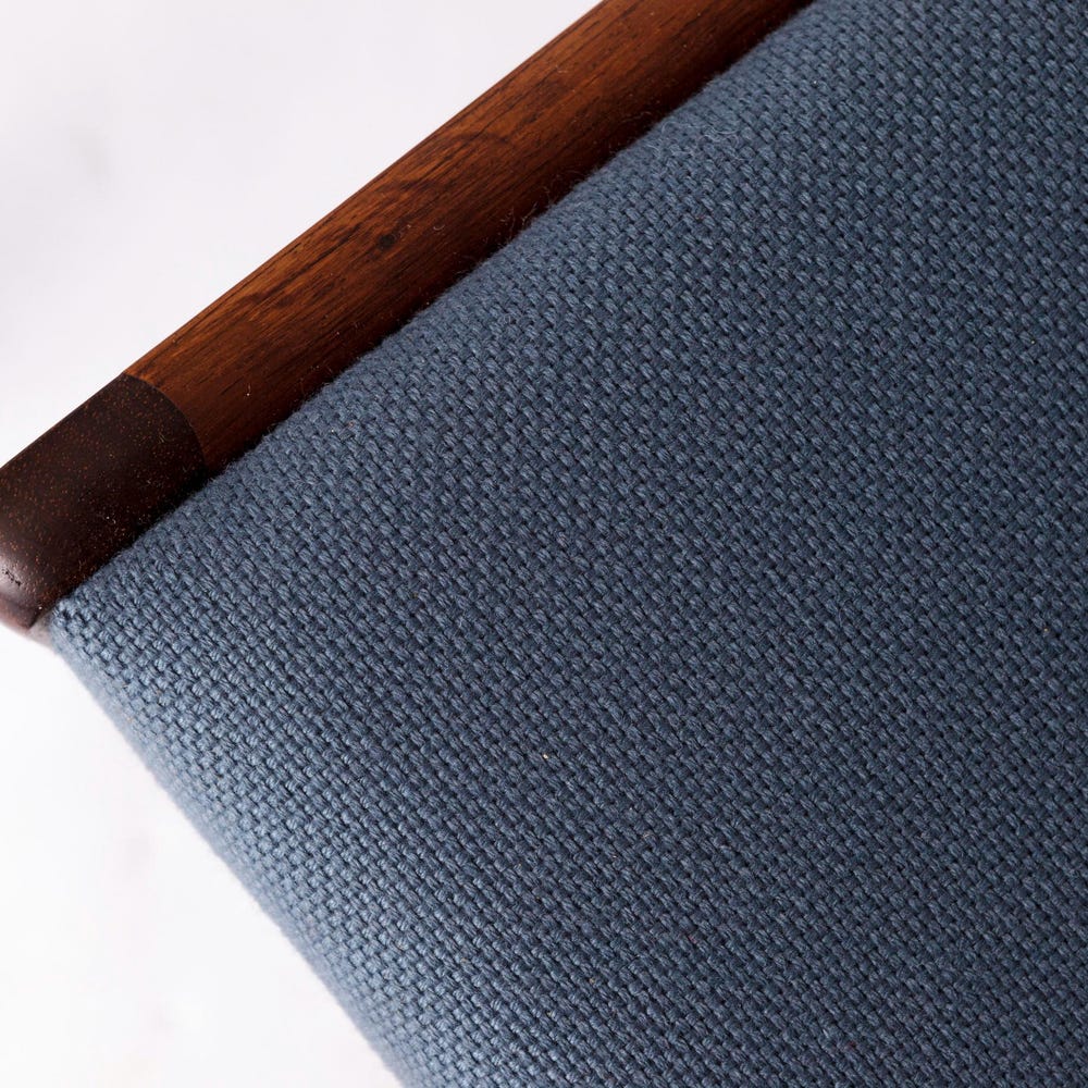 The seat and backrest have been newly reupholstered in a high-quality blue fabric, offering both comfort and a striking visual contrast to the dark wood.