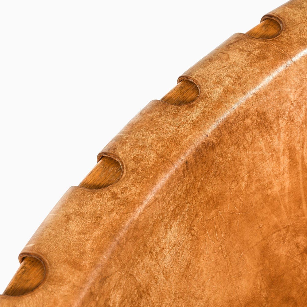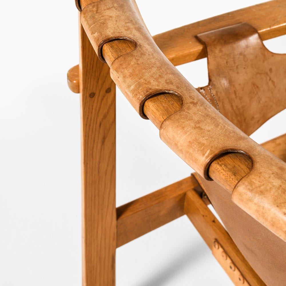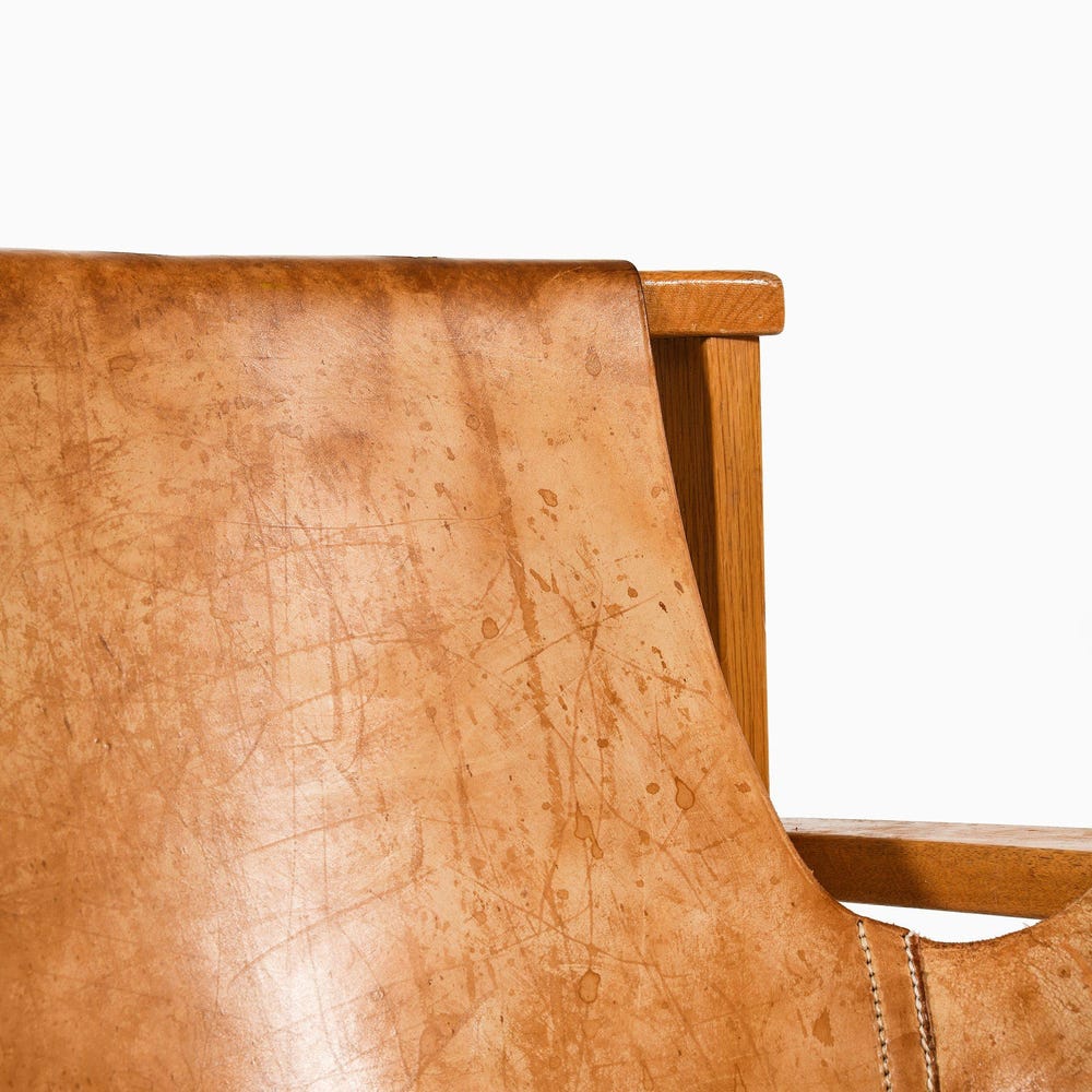 Each chair is constructed from solid oak with its natural grain and tone preserved, and features original aged leather upholstery with beautiful, organic patina developed over decades. The low-profile frame and reclined back offer exceptional lounging comfort while embodying the minimalist elegance iconic of 1950s-60s Nordic interiors.