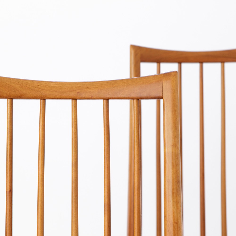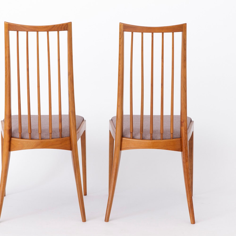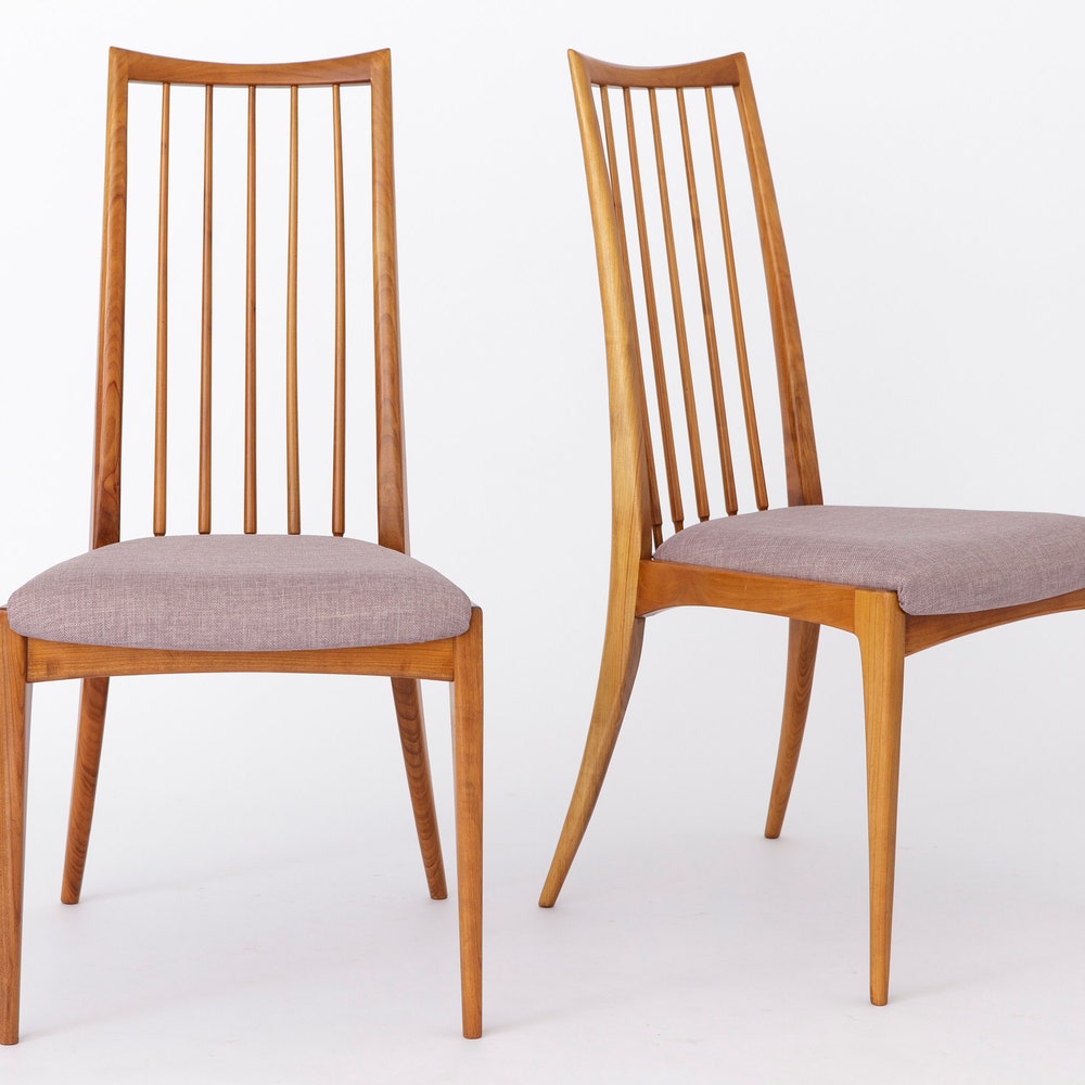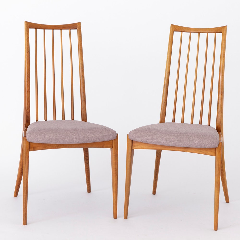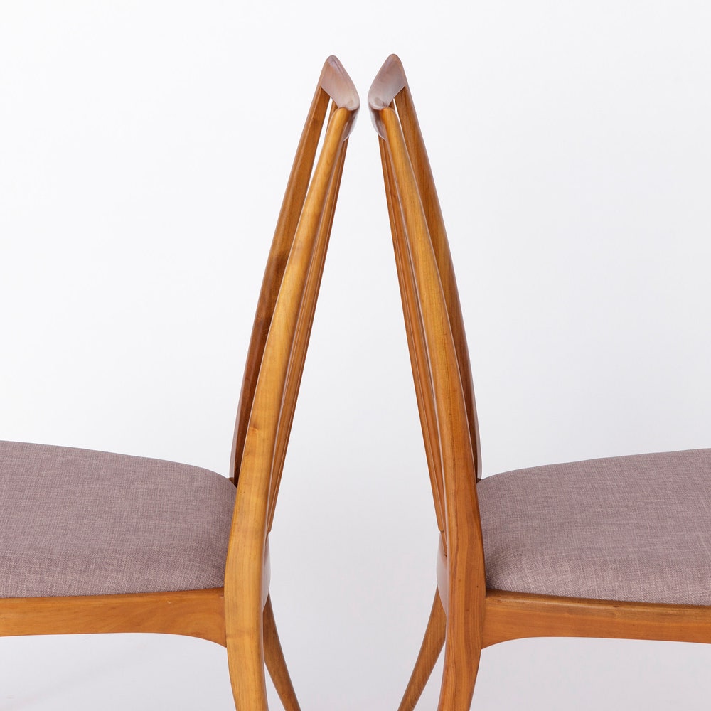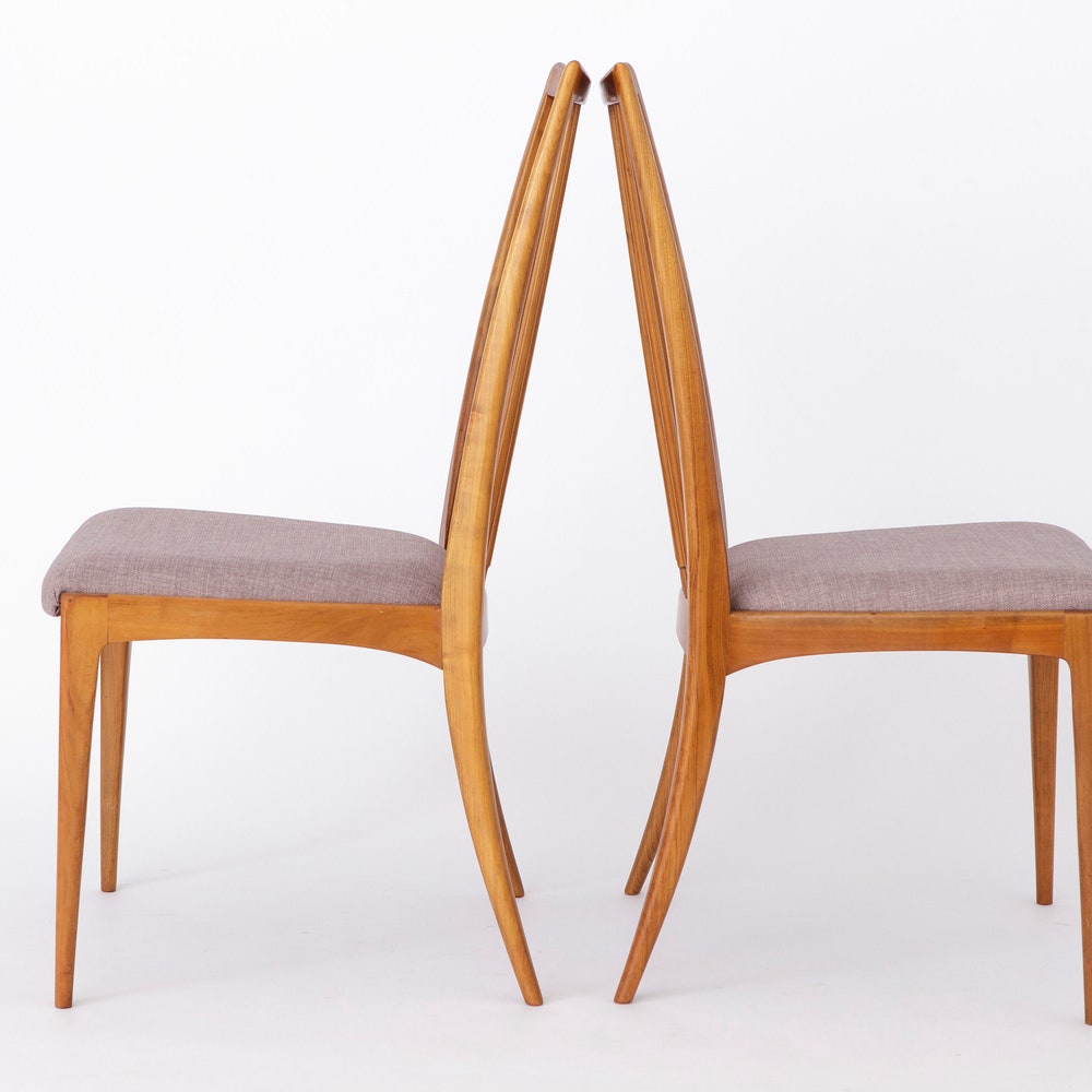 Add a touch of vintage charm to your home with this stunning pair of German chairs, designed by the renowned Ernst Martin Dettinger. Crafted in the 1960s, these sturdy chairs feature beautifully refurbished wooden frames made from either pear or cherry wood. The seats are reupholstered in a rich purple textile, adding both elegance and comfort.