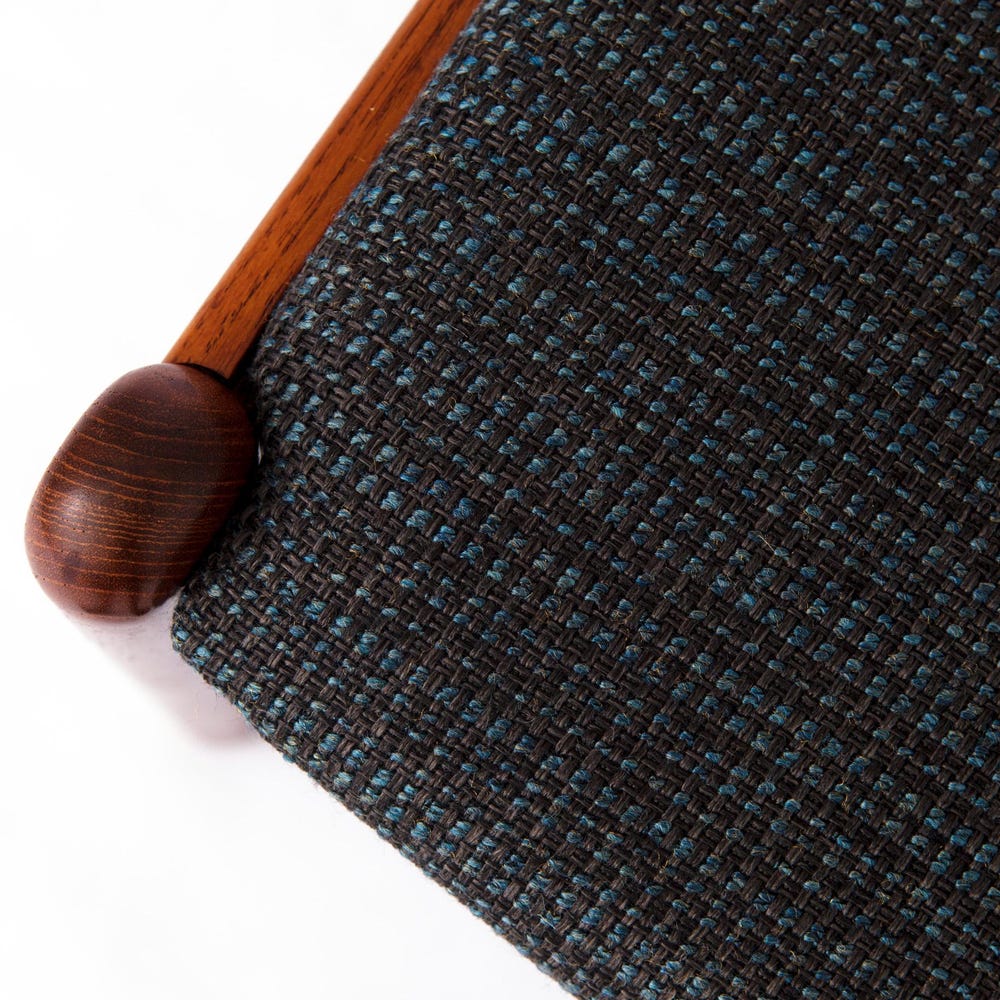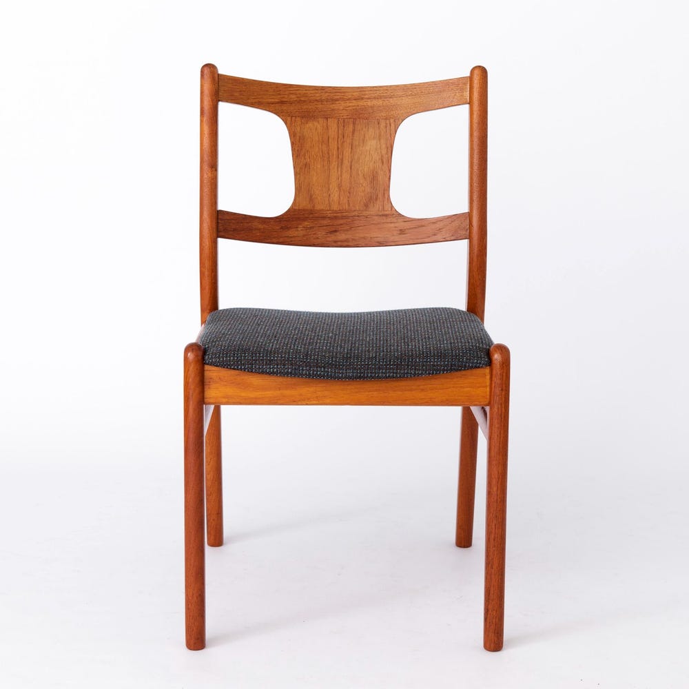 This impressive set of vintage chairs from Denmark, produced in the 1960s, showcases sturdy teak wood frames that have been refurbished and oiled for lasting durability. The reupholstered seats feature a stylish dark textile cover, offering both comfort and elegance.