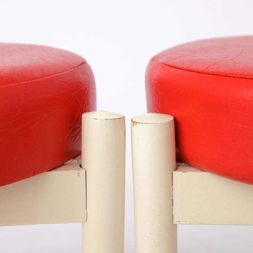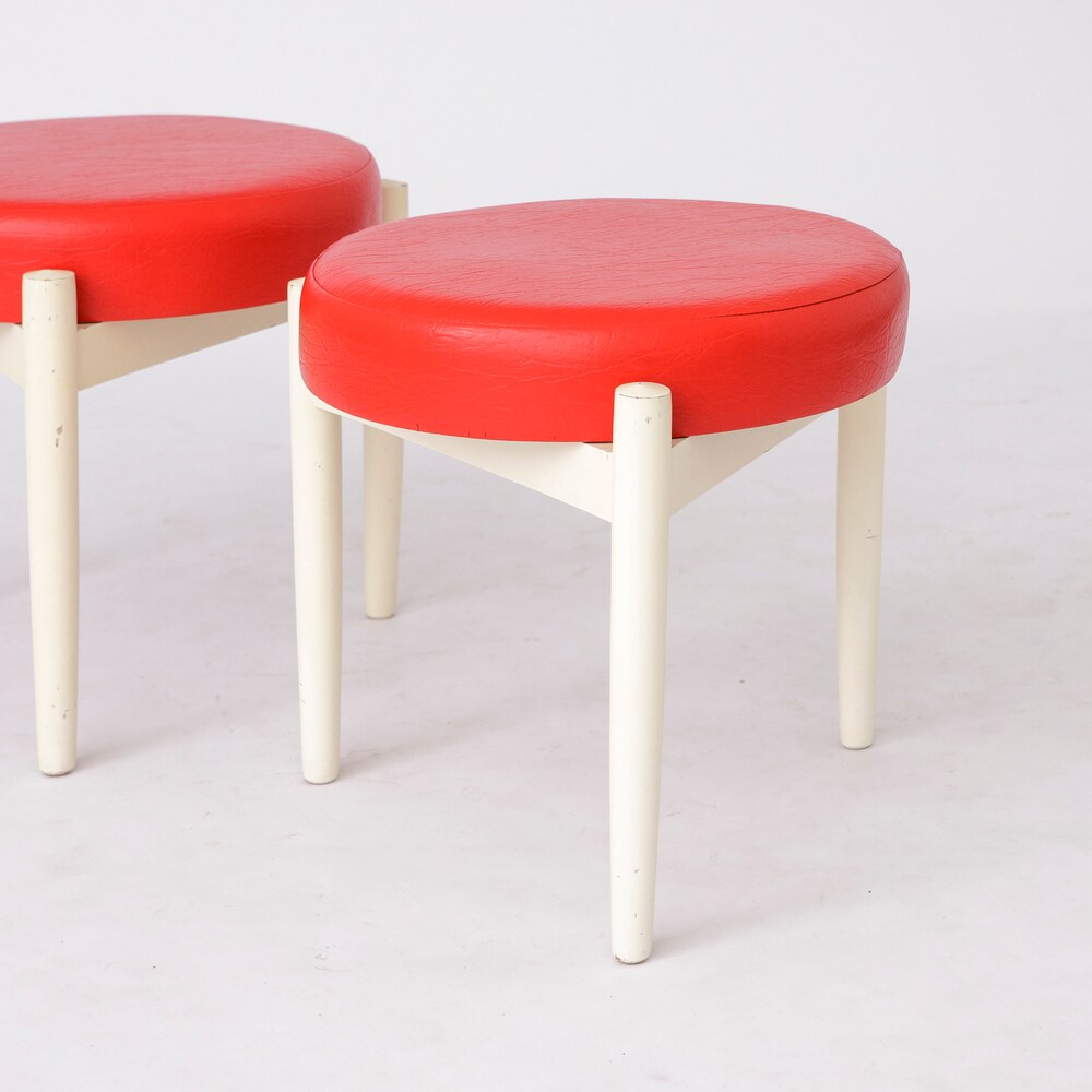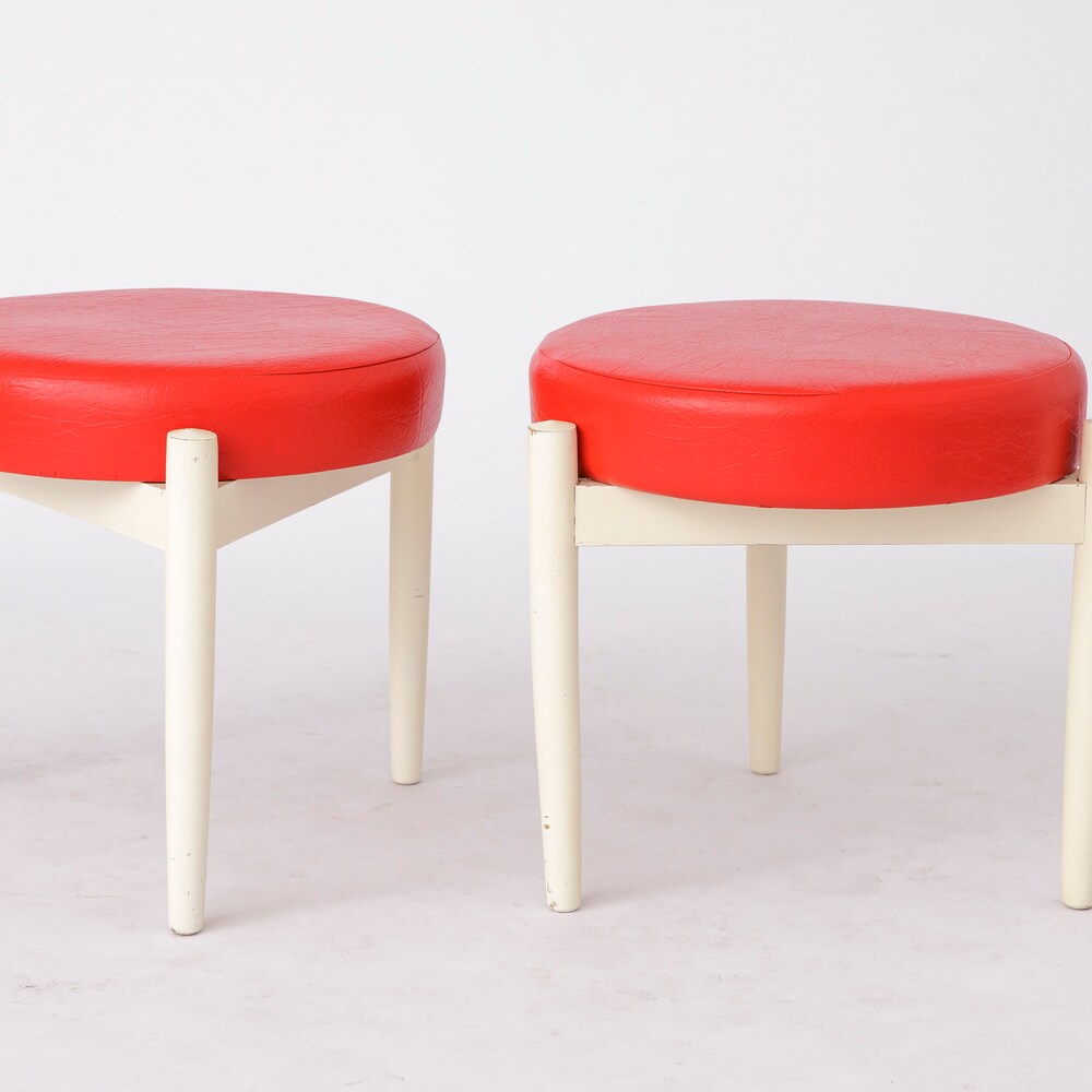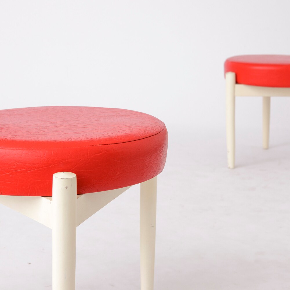 Pair of Vintage Three-Legged Ottomans by Hugo Frandsen, 1960s | White Lacquered Beech, Red Skai Upholstery | Danish design