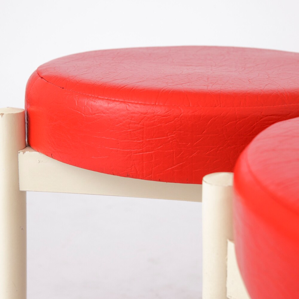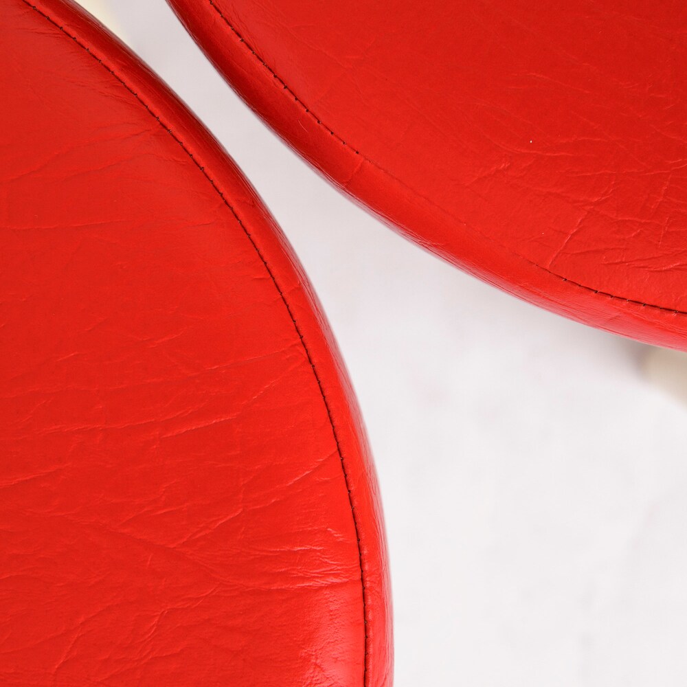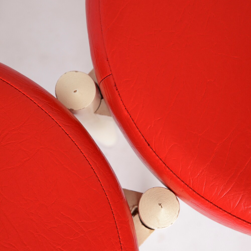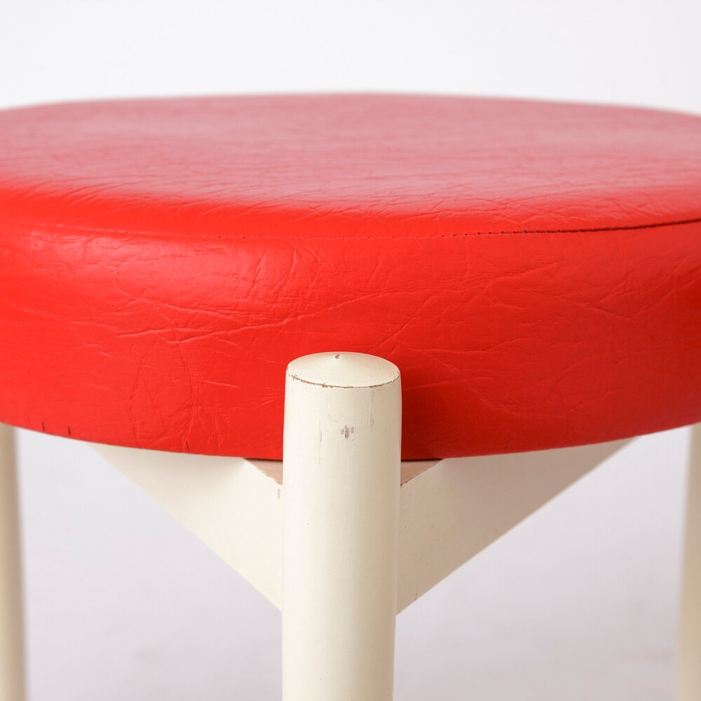 Pair of Vintage Three-Legged Ottomans by Hugo Frandsen, 1960s | White Lacquered Beech, Red Skai Upholstery | Danish design