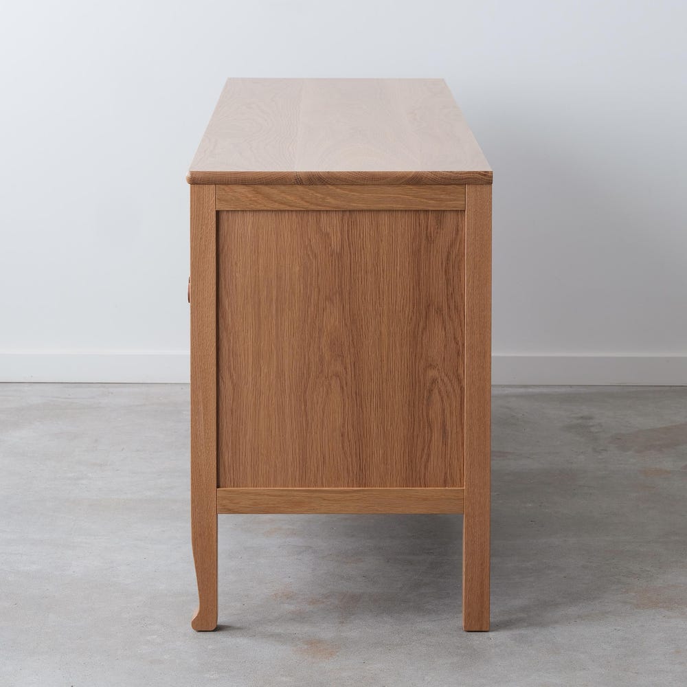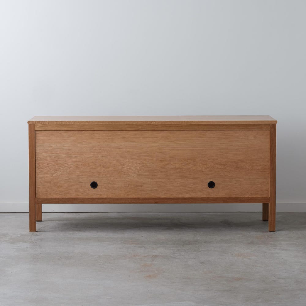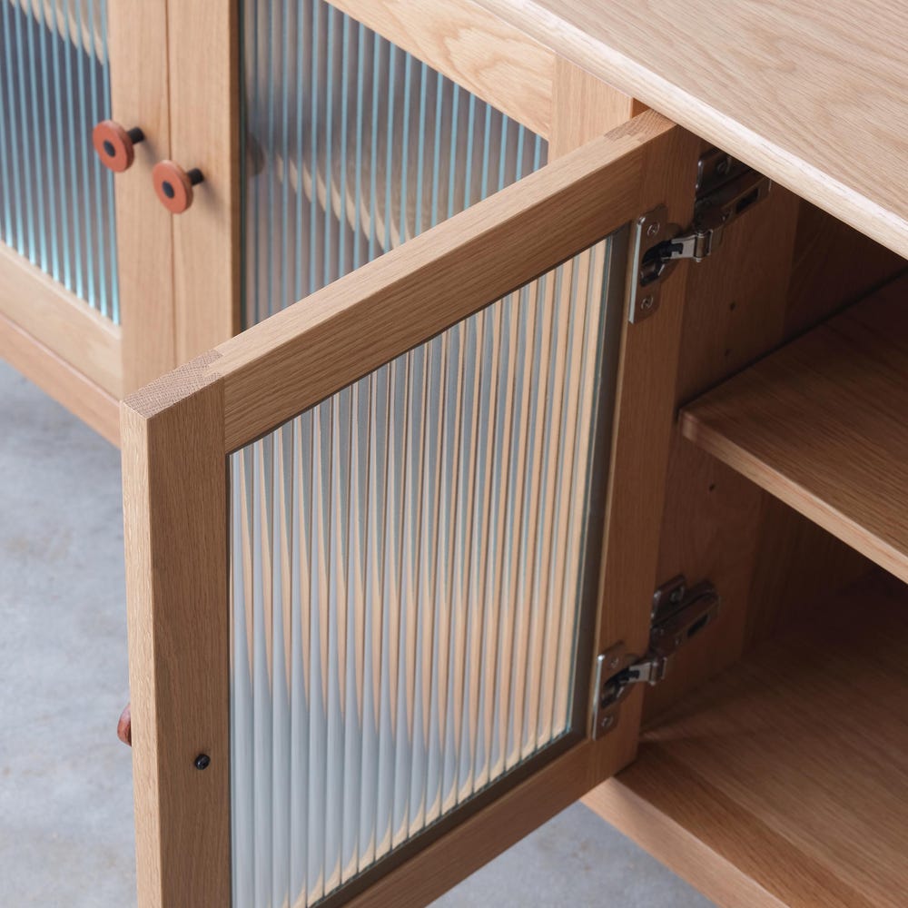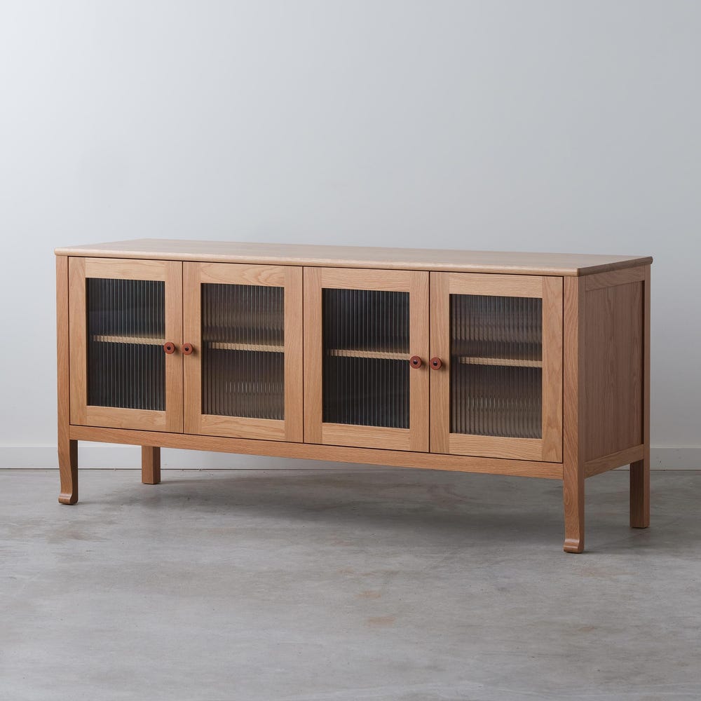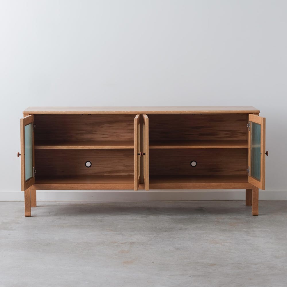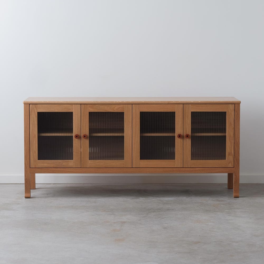Featuring 4 fluted glass doors. Includes:Two cord-cutouts (positioned low, centered)Two adjustable shelves (with half moon cutouts for cord management) Pictured: White oakHardware: Round leather pull Also available: Walnut, Cherry, or MapleFinished with a clear, low sheen conversion varnish to provide durability and water resistance. DIMENSIONS60″ Wide x 17.5″ Deep x 27″ High Built to order. […]