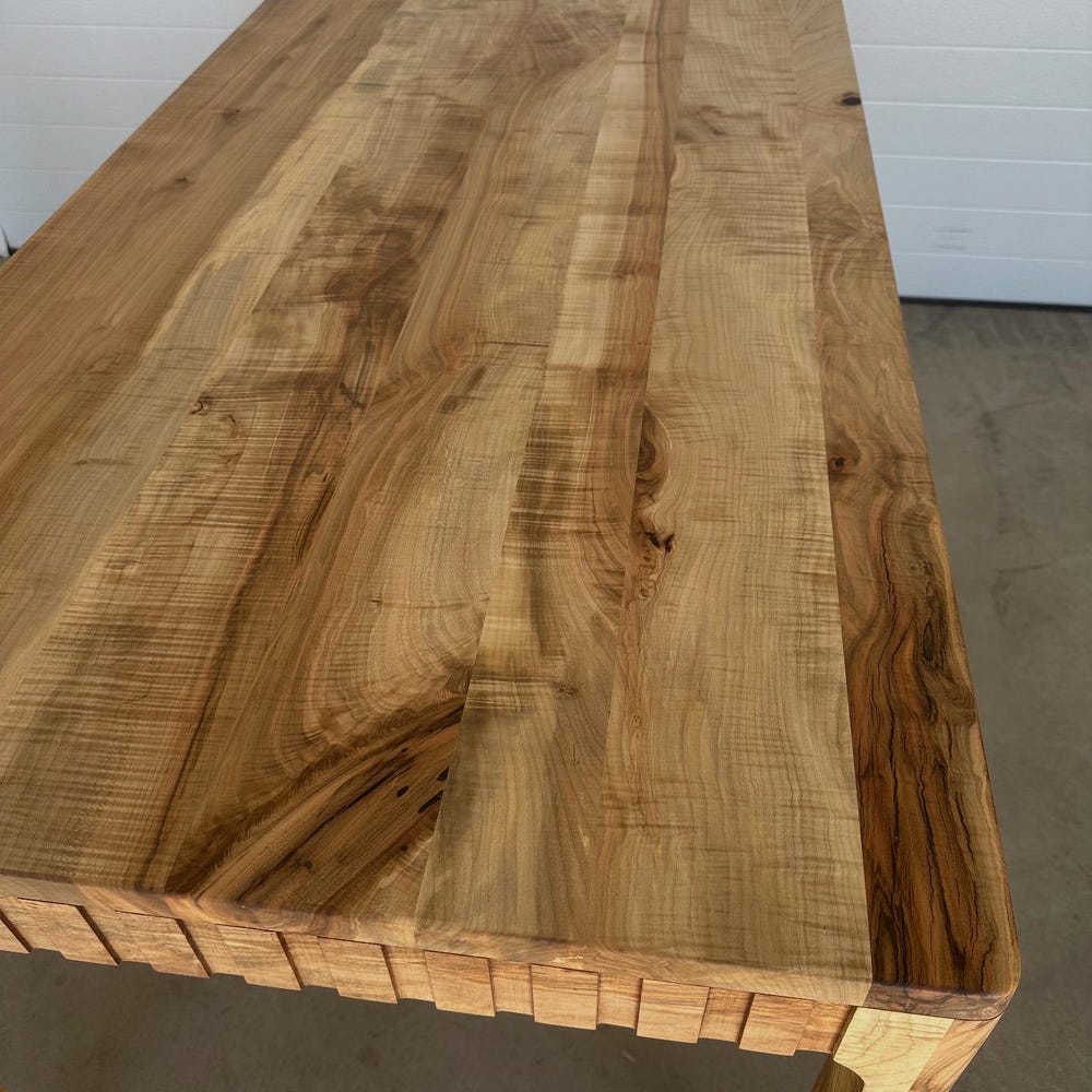 All voids, knots, cracks, and imperfections amongst the wood material will be filled with epoxy or inlays at our discretion. This also means some voids, cracks, or knots may not be filled. Our decisions are made to enhance the quality, stability, and functionality of the piece. We use salvaged or character-grade materials, so knots, cracks, voids, and imperfections of various sizes are to be expected. Multiple grain matched pieces, but not limited to edge jointing, end jointing, etc, are a standard practice within our products. Decisions for your build are based on the available materials at the time of construction to meet your custom specifications (length, height, depth). Your piece will be one of a kind, please allow for artistic freedom.
