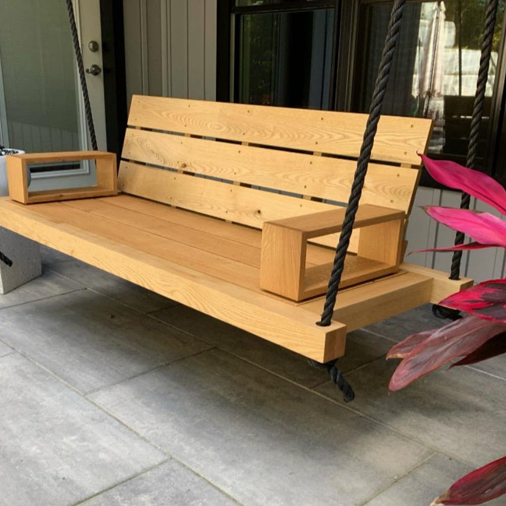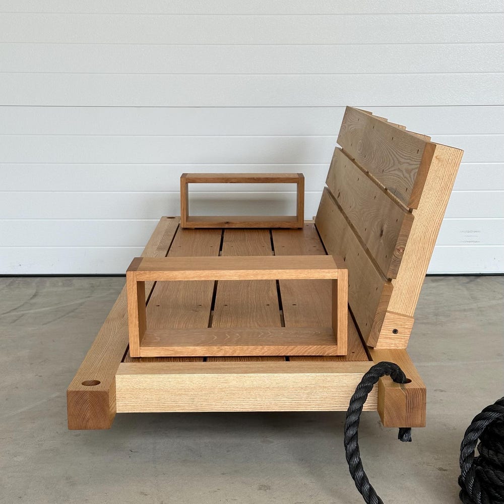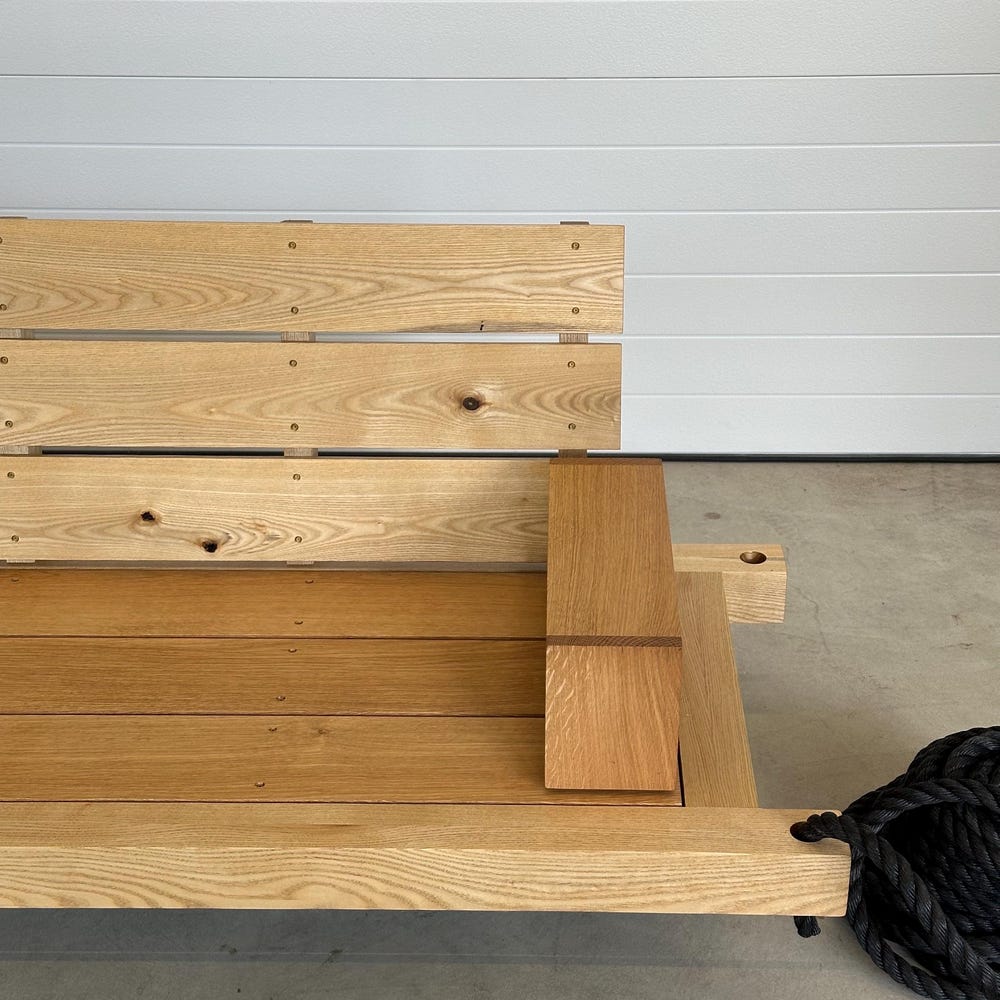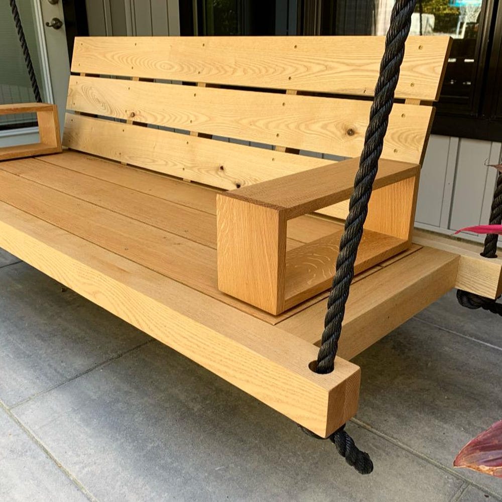A take on our patio sectionals, a style we’ve crafted many times. This patio swing is made with white oak seats and armrests, while the frame and back are built from sassafras. Perfect for creating a welcoming outdoor space to gather and relax.