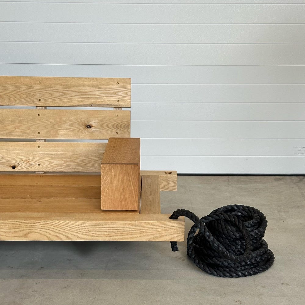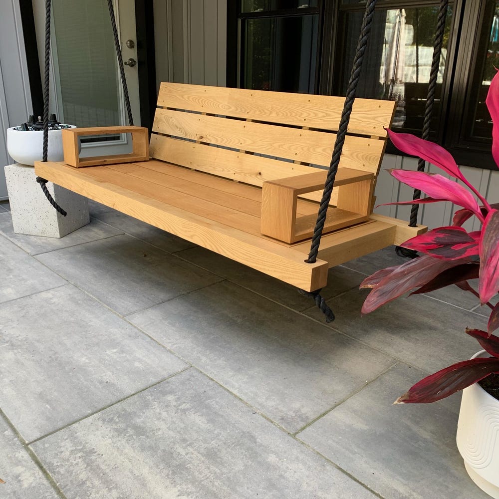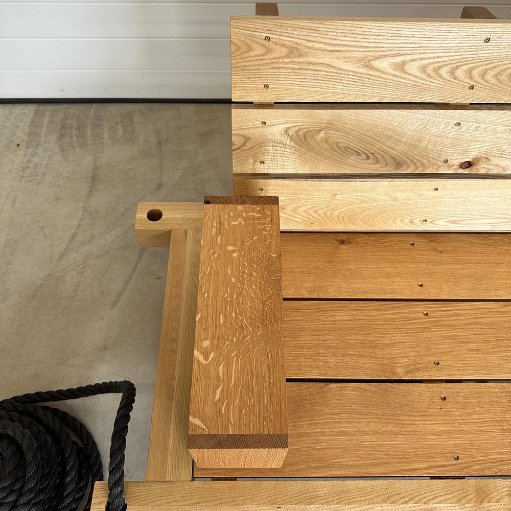 A take on our patio sectionals, a style we’ve crafted many times. This patio swing is made with white oak seats and armrests, while the frame and back are built from sassafras. Perfect for creating a welcoming outdoor space to gather and relax.