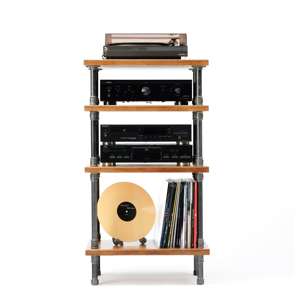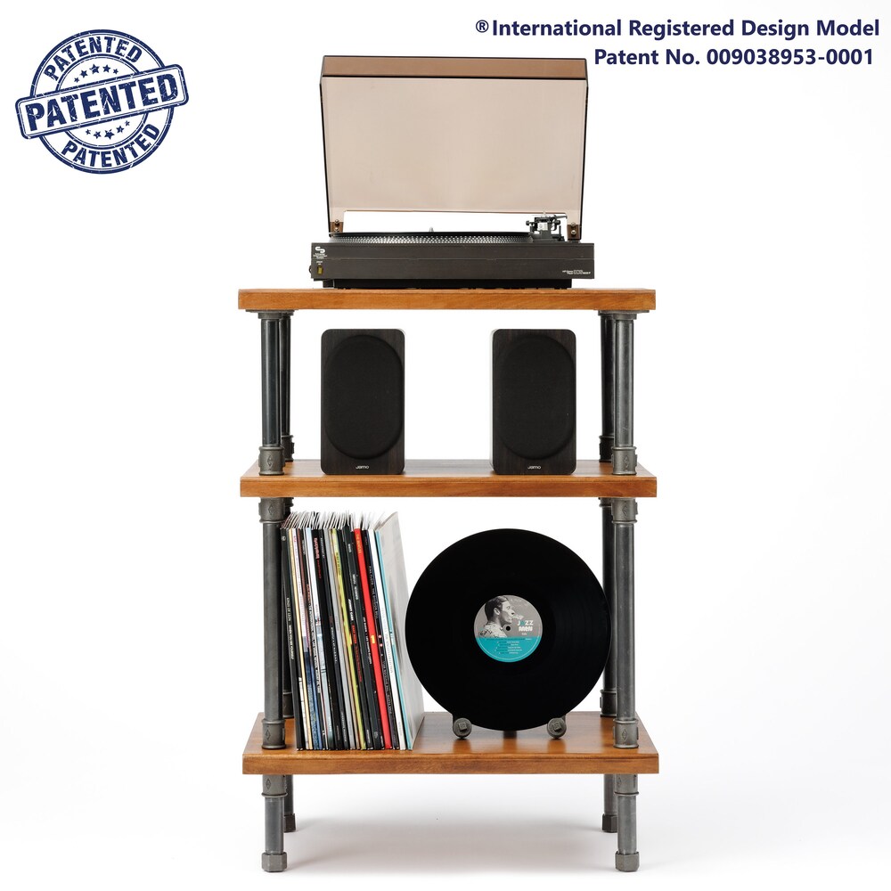 2 IN 1 Registered design stand, 5 Tier Oak Black rods stand, audio rack / Record player stand / Turntable stand / Threaded rod shelf