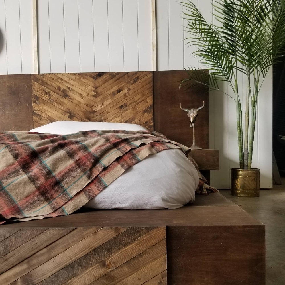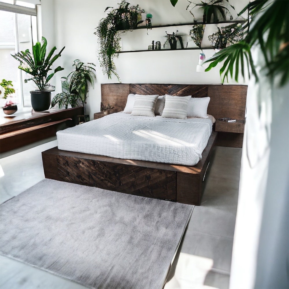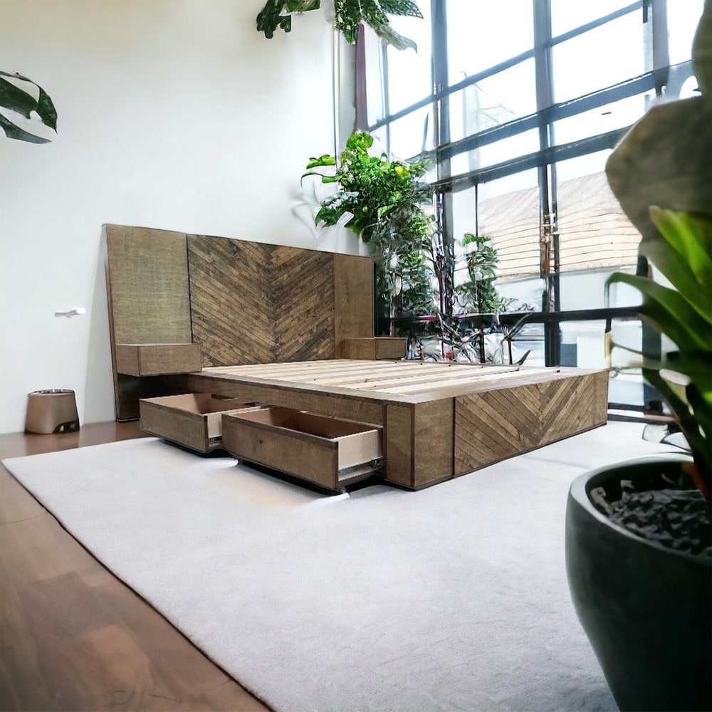 Its intricate chevron cladding and built-in nightstands offer style and functionality, making it the perfect centerpiece for your rustic or modern home. Order now to transform your space with this bespoke bed frame.