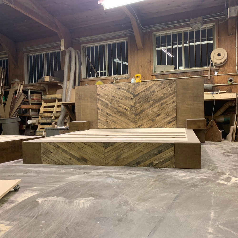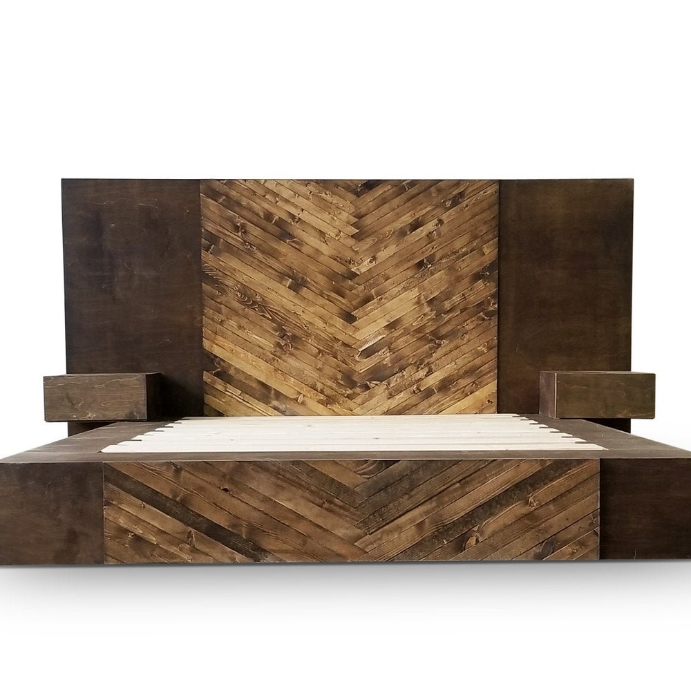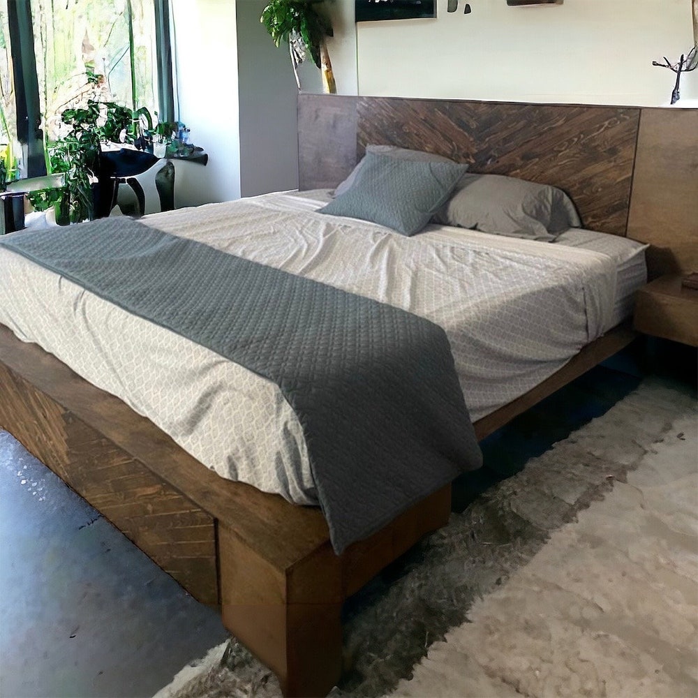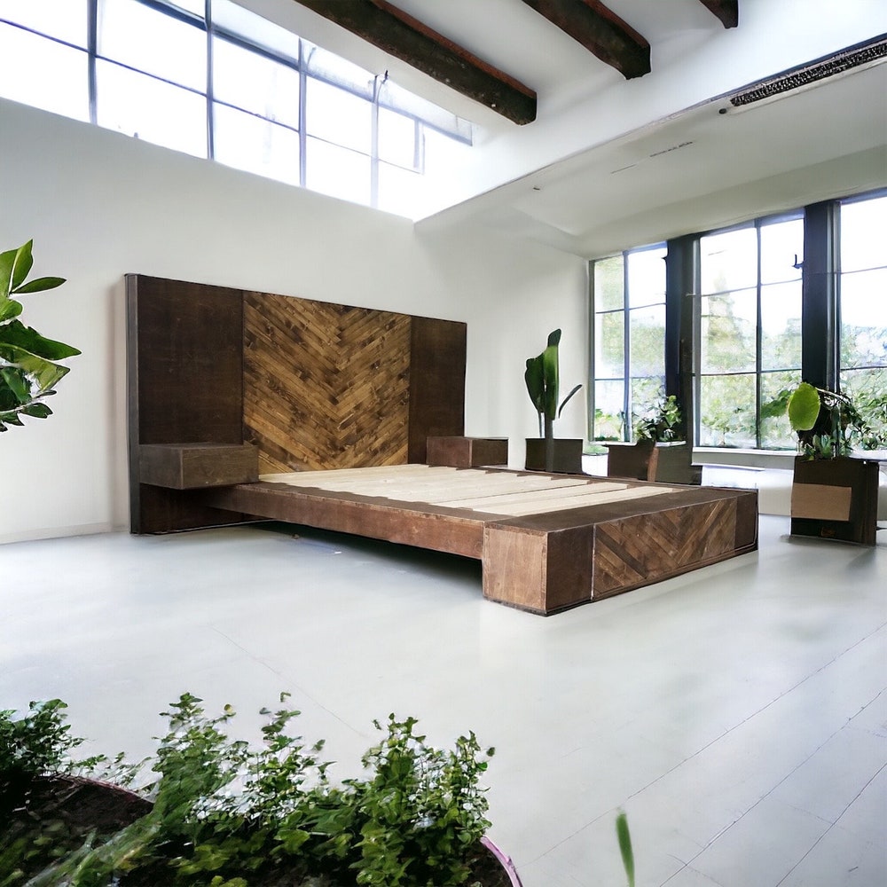 Its intricate chevron cladding and built-in nightstands offer style and functionality, making it the perfect centerpiece for your rustic or modern home. Order now to transform your space with this bespoke bed frame.
