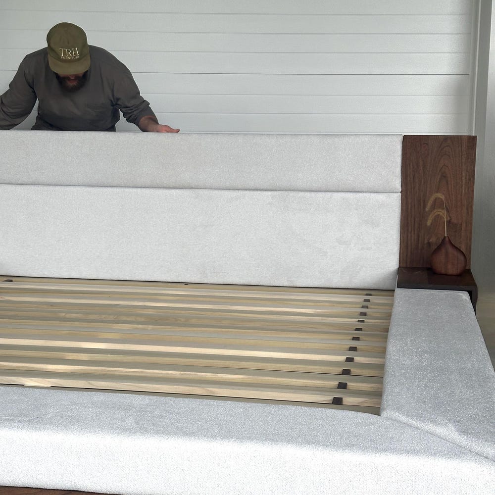 A platform bed built using Walnut with padded upholstery featuring nightstands seamlessly integrated into the design to enhance both function and style. These built-in nightstands serve as a striking focal point, highlighting the natural beauty of the wood and craftsmanship in a simple, modern design.
