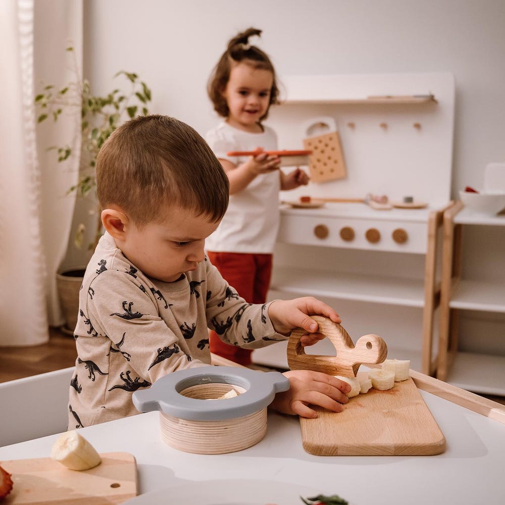 Craftsmanship reigns supreme, evident in every detail of the Woodjoy Toy Kitchen Type A2. Lateral parts boast solid beech wood, enhanced with a water-based transparent lacquer finish that adds a touch of elegance. Meanwhile, the back panel and shelves showcase exquisite birch plywood, adorned with a water-based transparent or colored lacquer for an enchanting appeal.