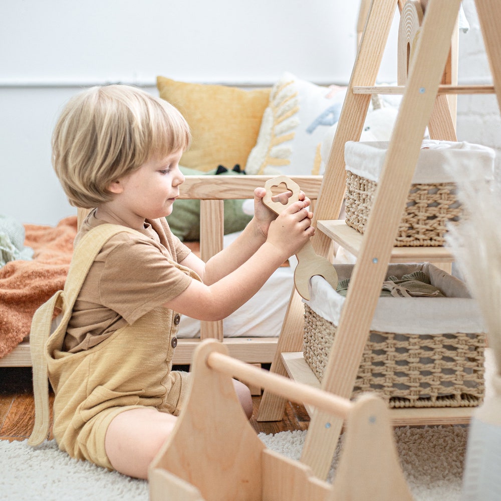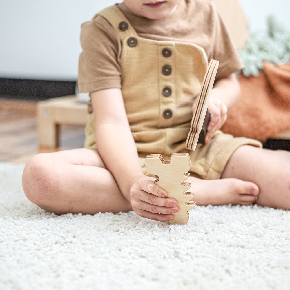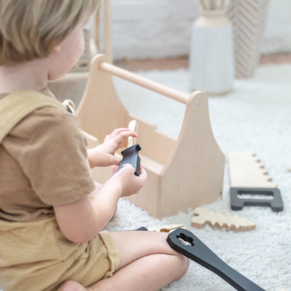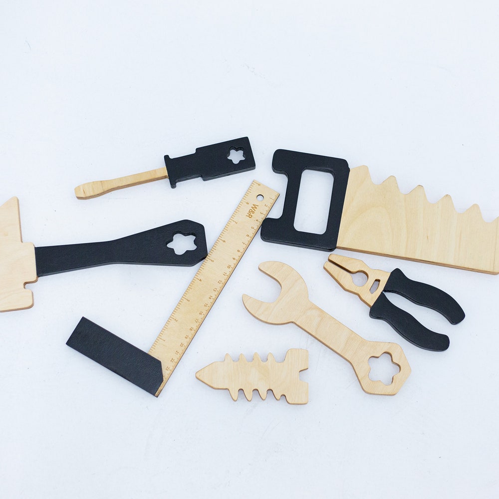 🔎 This wooden interactive kit features toy tools like a hammer, screwdriver, wrench, angle ruler and bolts that are safe and easy for little hands to grasp.