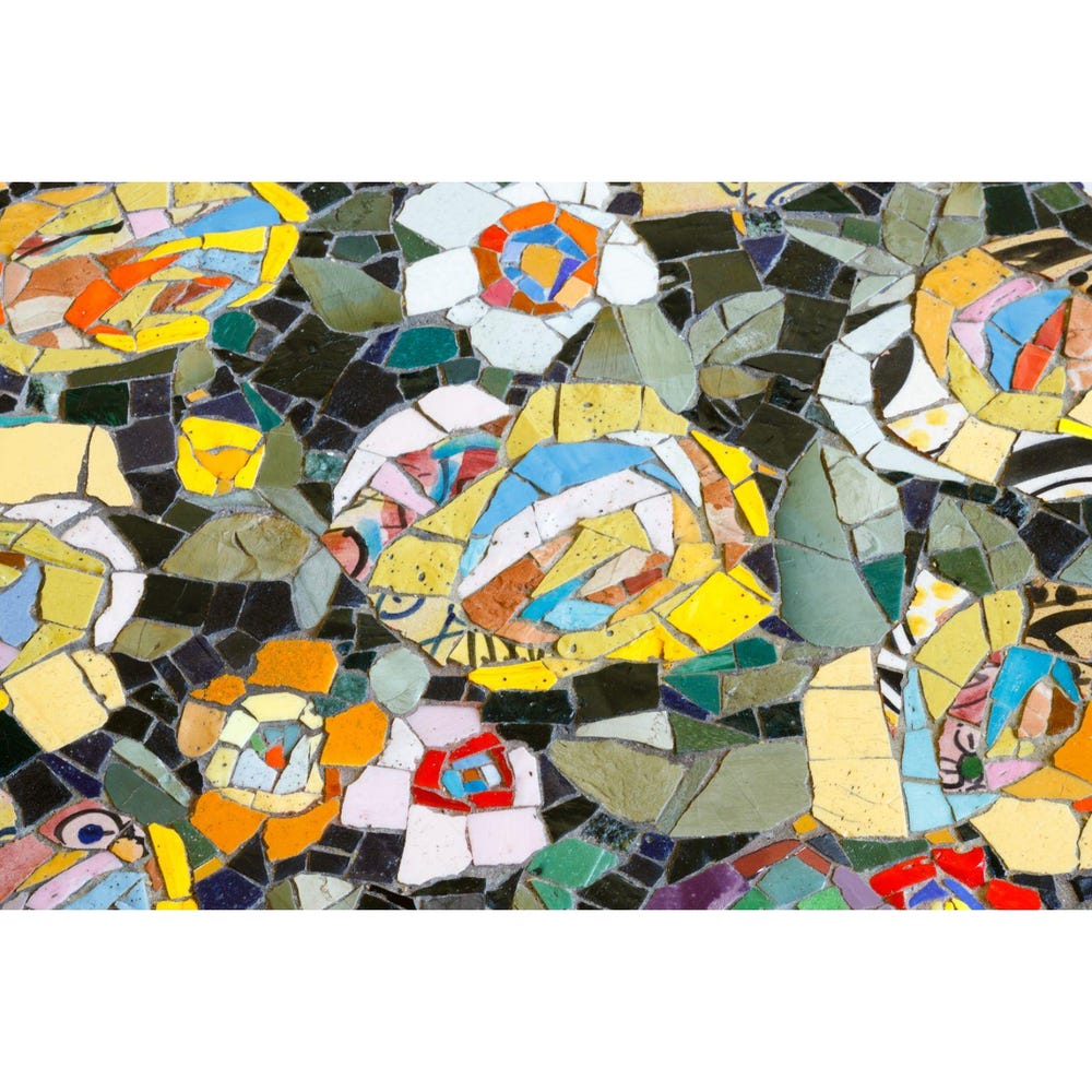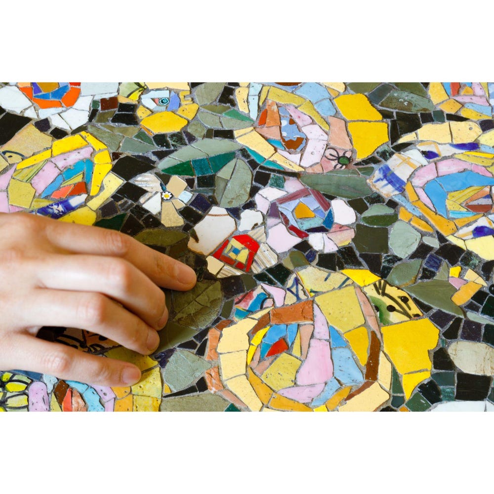What appears at first glance to be wood, fabric, or embroidery reveals itself — upon touch — to be a finely crafted mosaic. This playful “visual deception” creates a dynamic sense of discovery and amusement, blending contemporary art with traditional mosaic craft.