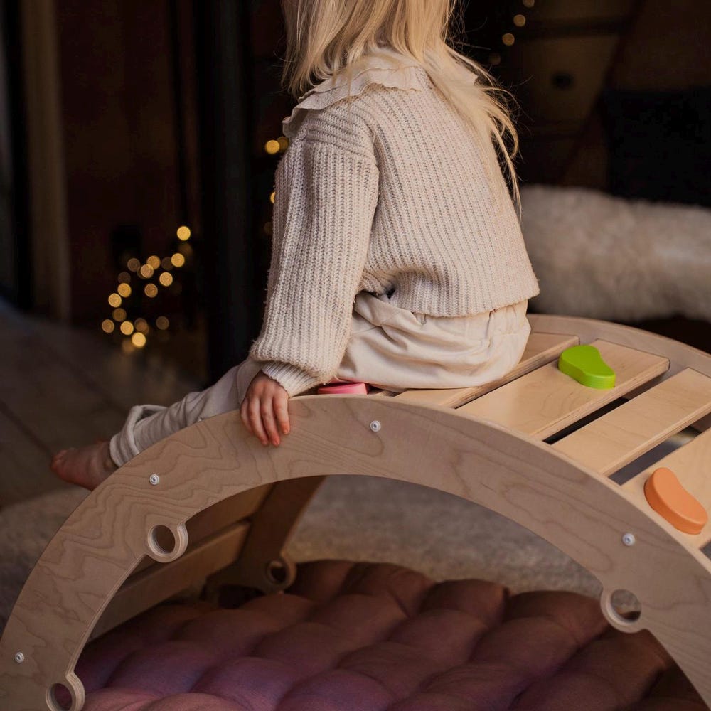 ARCH: Our arch is unique with added stones which helps to improve cognitive skills. HappyMoon Montessori arch can be used as a separate element or as a part of the HappyMoon climbing set. Use the arch as a balance board, ramp, ladder, rocker, play screen, tent, or come up with your own version of using it.