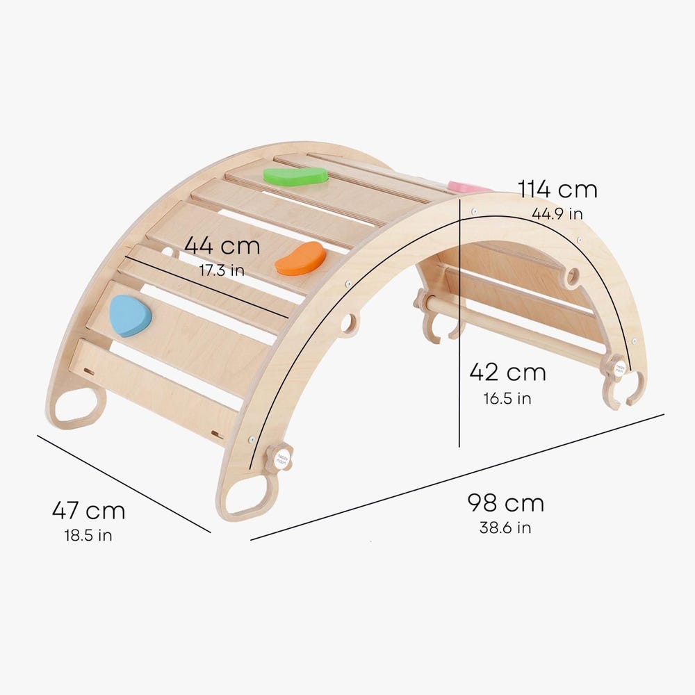 ROCKER: Our wooden climbing arch-rocker has perfectly finished edges and in the package comes 2 dowels with 4 small HappyMoon screws which allow toddlers to feel more comfortable and stable when swinging. HappyMoon smart design protects your toddler fingers from pinch.