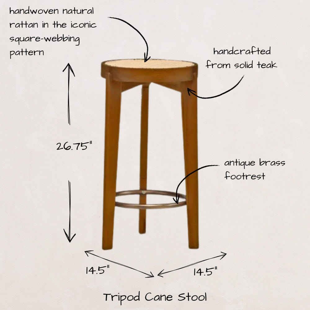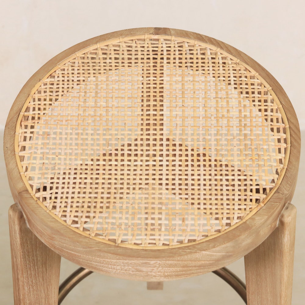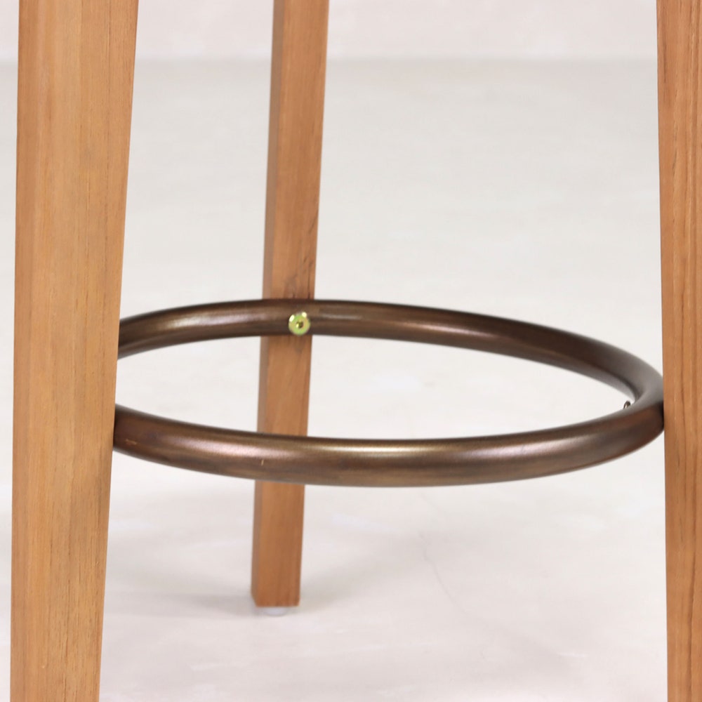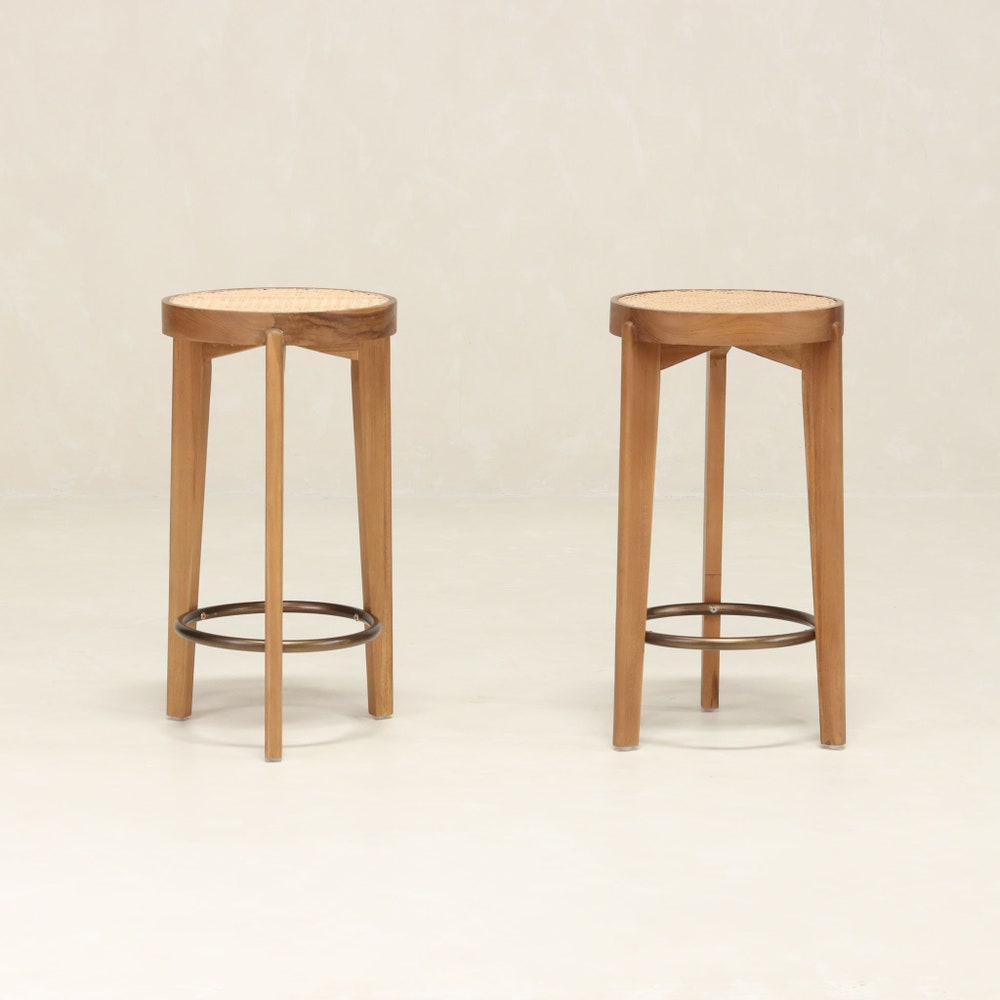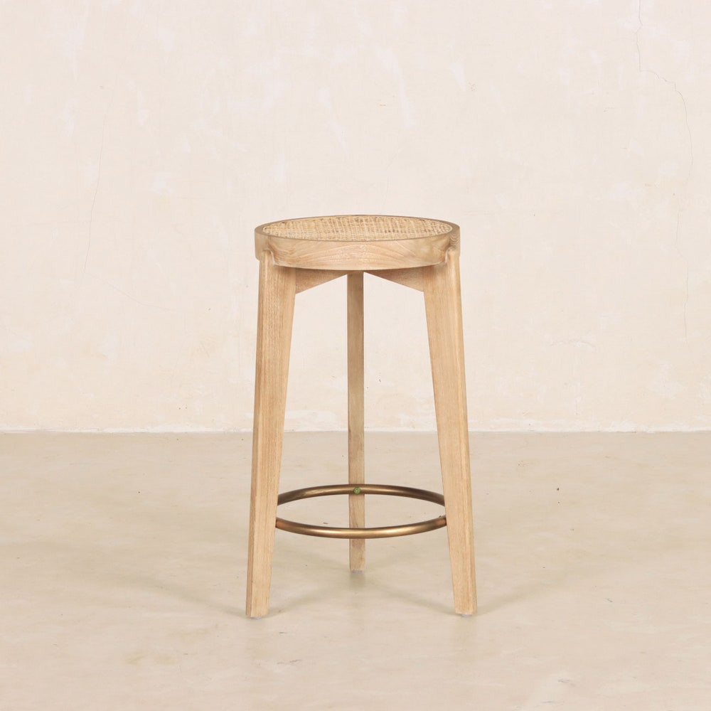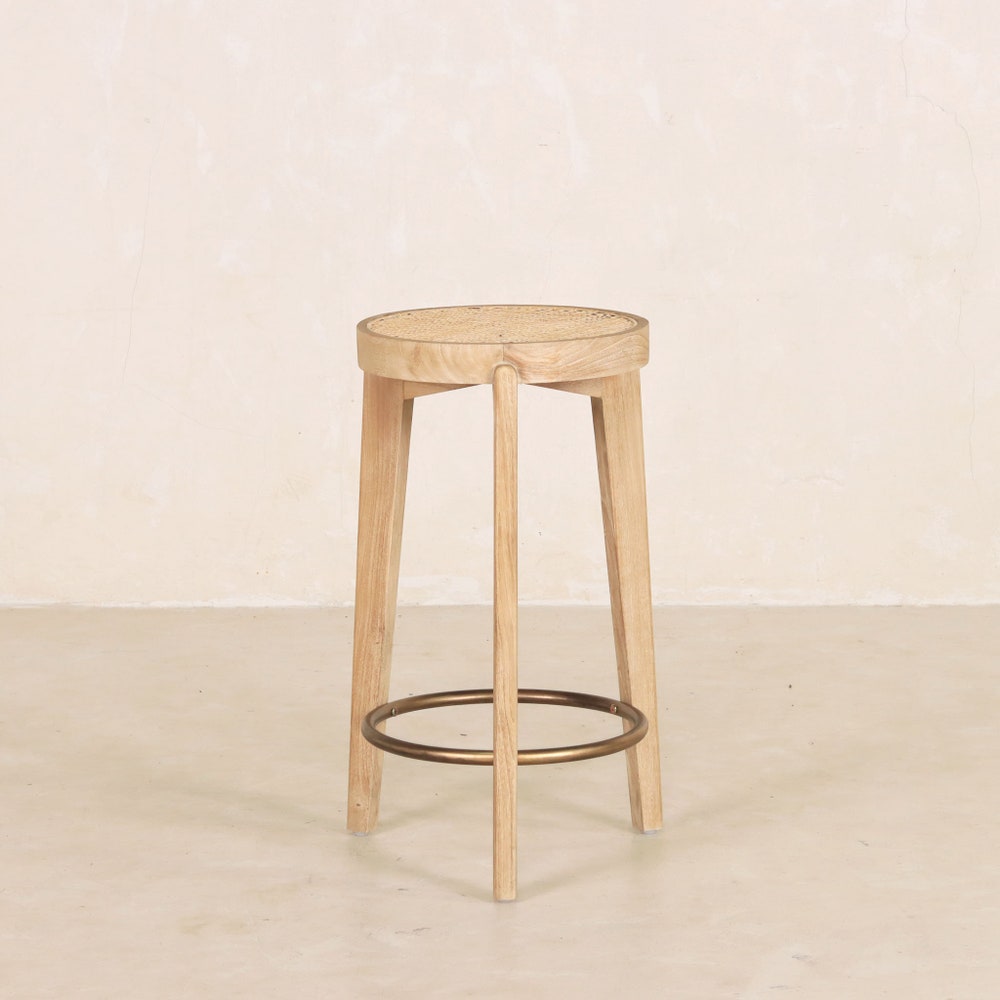 The Capitol Cane Counter Stool- 3 Legs has a rattan seat in the iconic webbing pattern and solid teak frame. The round seat frame is made of two concentric circles with gently rounded edges. An antique brass ring provides a footrest at the legs.