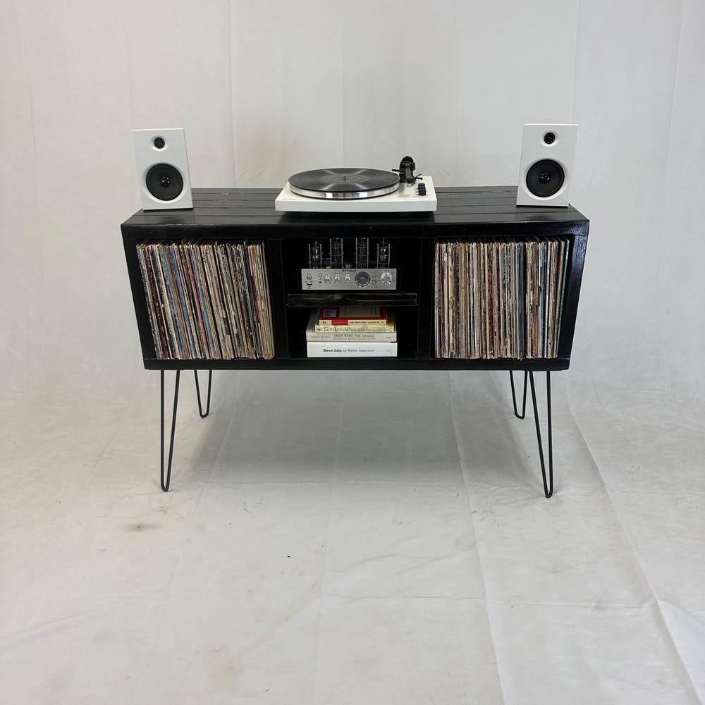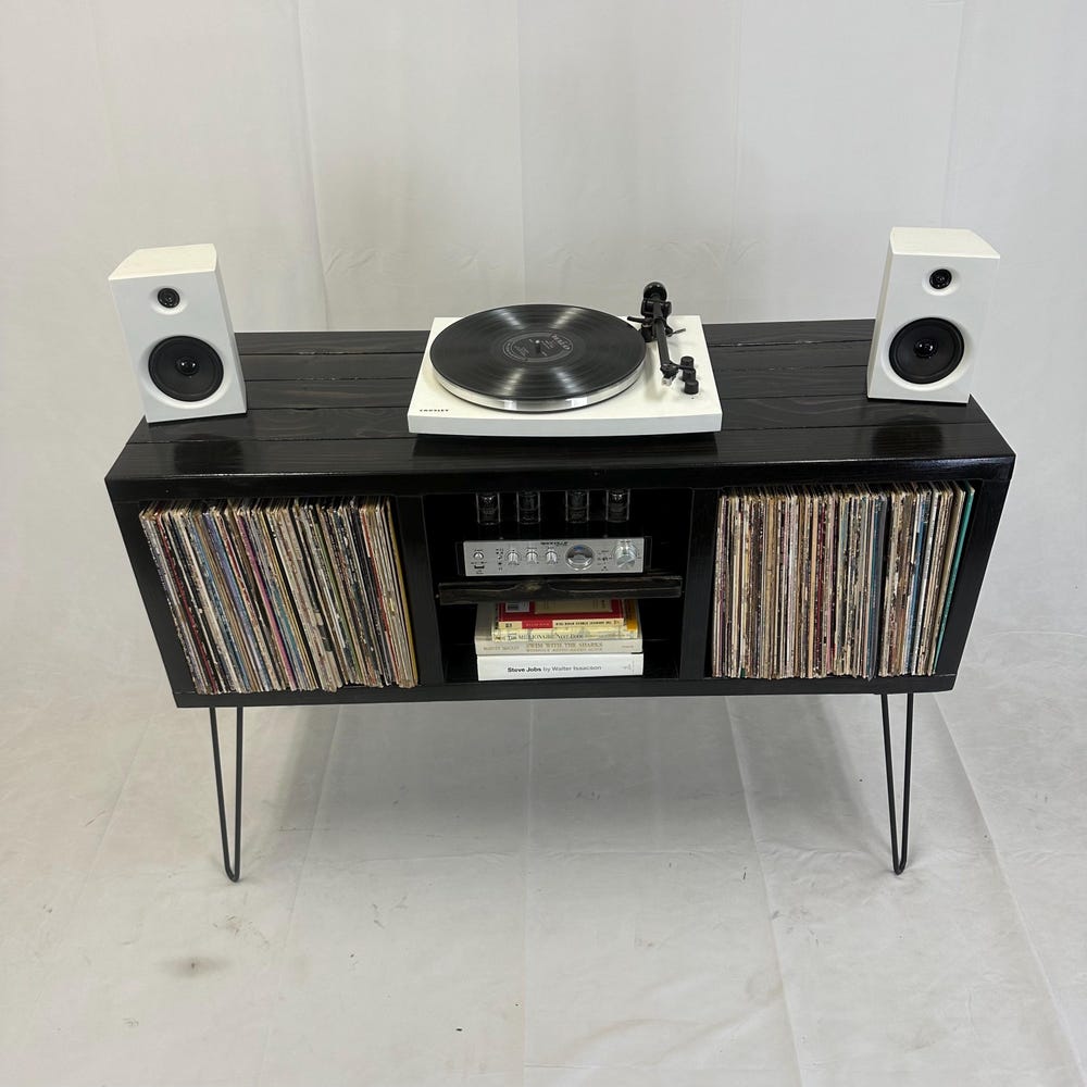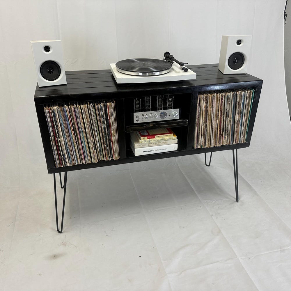 Ready to ship no substitutions available: 45 inch classic black widebody triple section record holder with vertically adjustable shelf