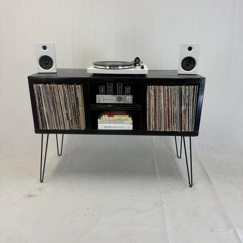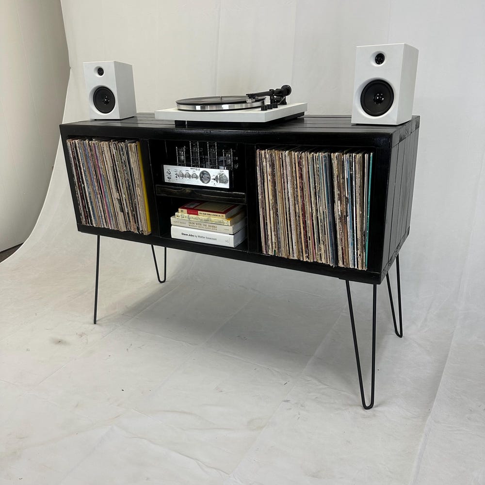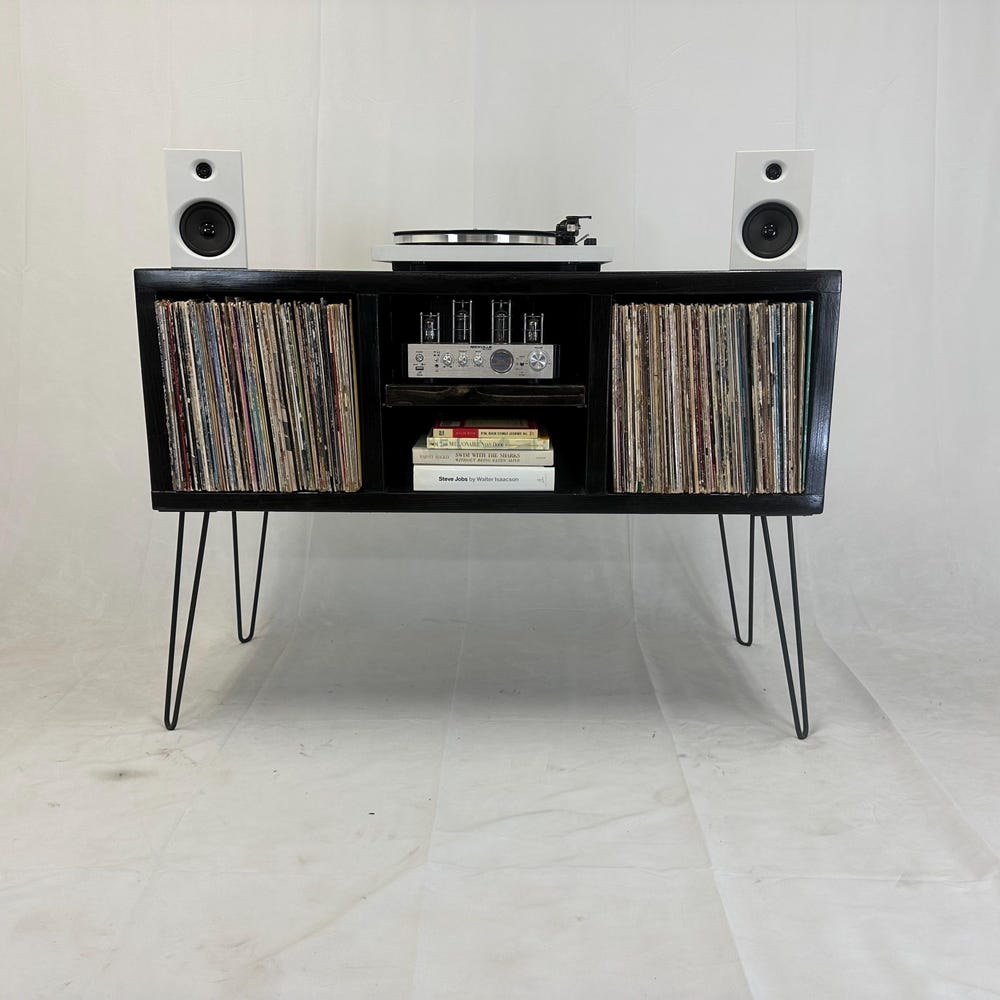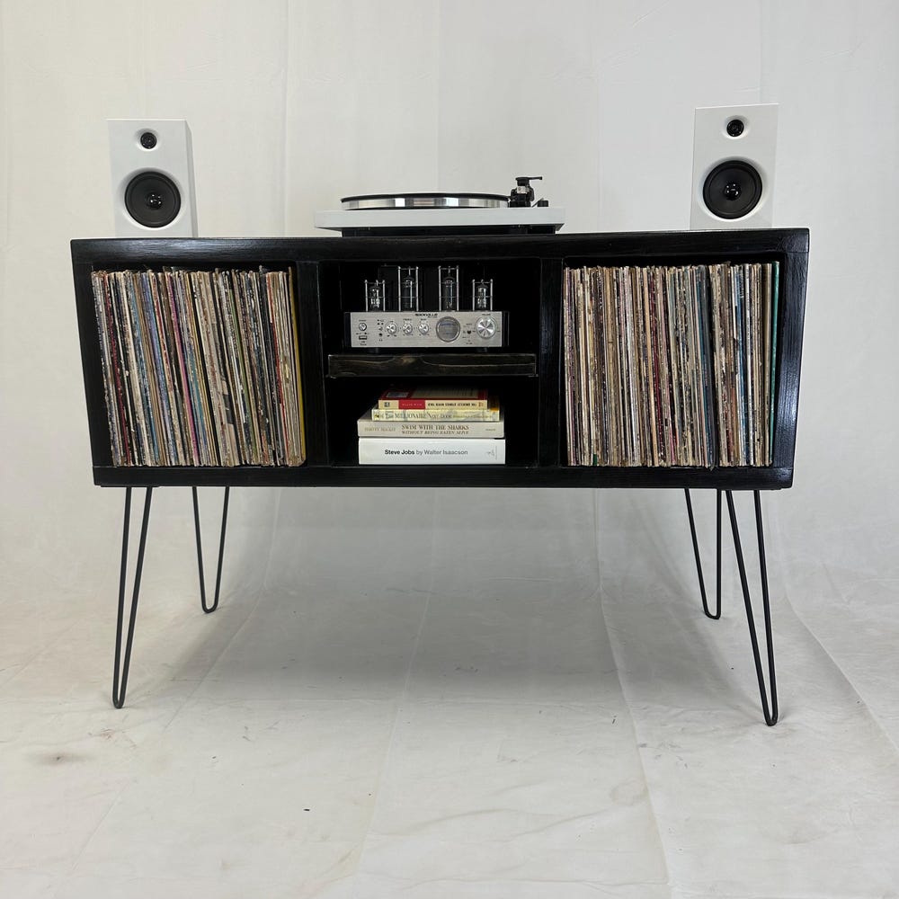 Ready to ship no substitutions available: 45 inch classic black widebody triple section record holder with vertically adjustable shelf
