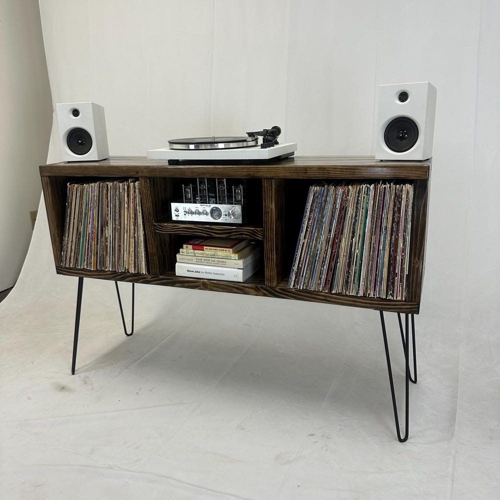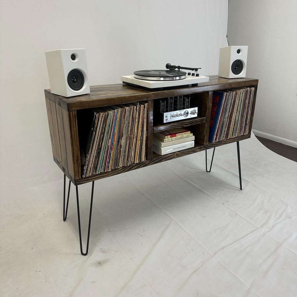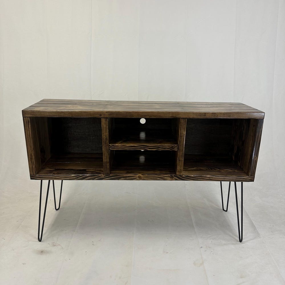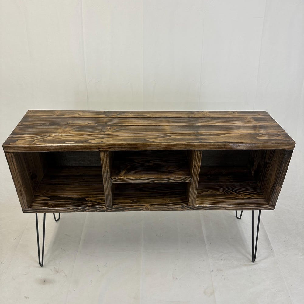Ready to ship, no substitutions available, item heavily discounted, as is 50 inch long 3 x 2 record holder16 inch hairpin legs32 inches total height, including 16 inch legsDark walnut color14 inch depth 15 inch center shelf left to right clearance