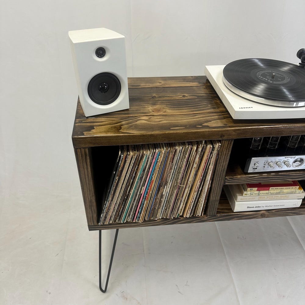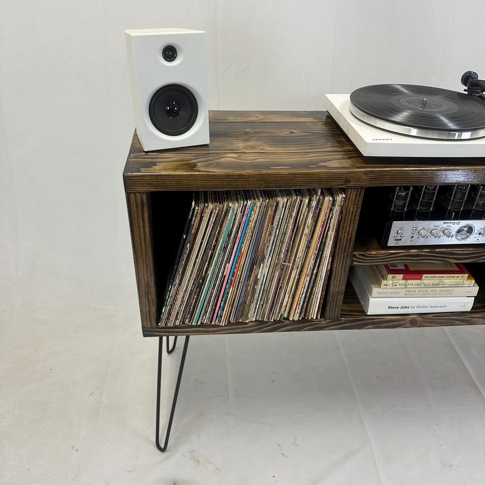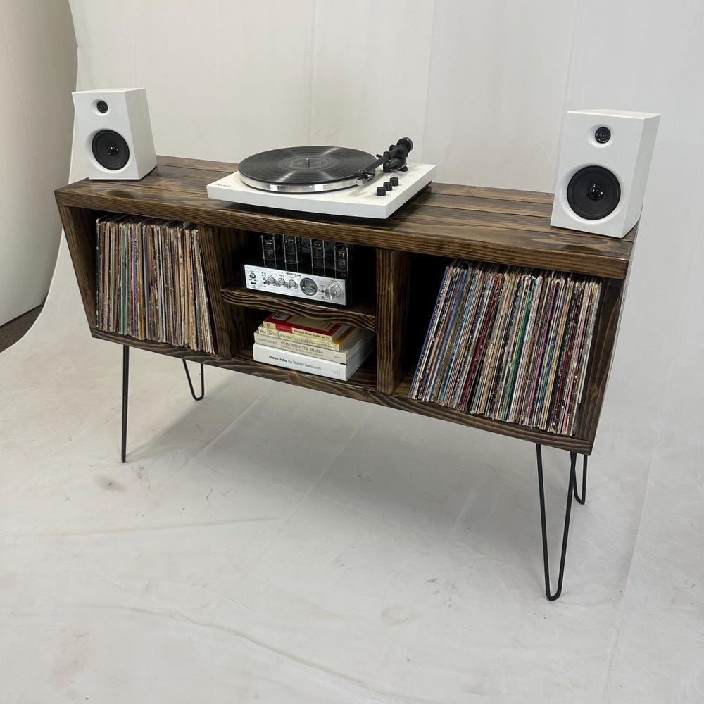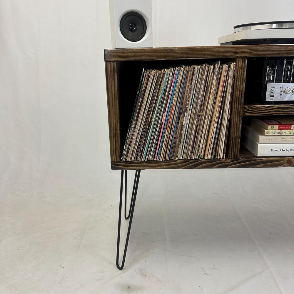 Ready to ship, no substitutions available, item heavily discounted, as is 50 inch long 3 x 2 record holder16 inch hairpin legs32 inches total height, including 16 inch legsDark walnut color14 inch depth 15 inch center shelf left to right clearance