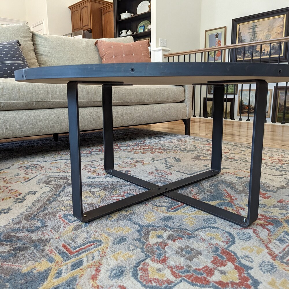 Made in our shop with 1/4″ thick 2″ wide flat raw steel bar. Legs go together with provided screws and allen wrench. Attach the top to base with included Philips screws. Level your table with included adjustable feet