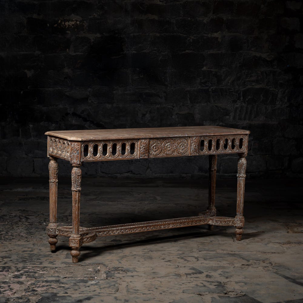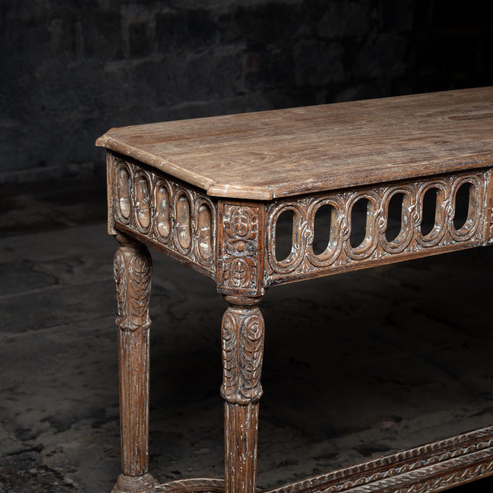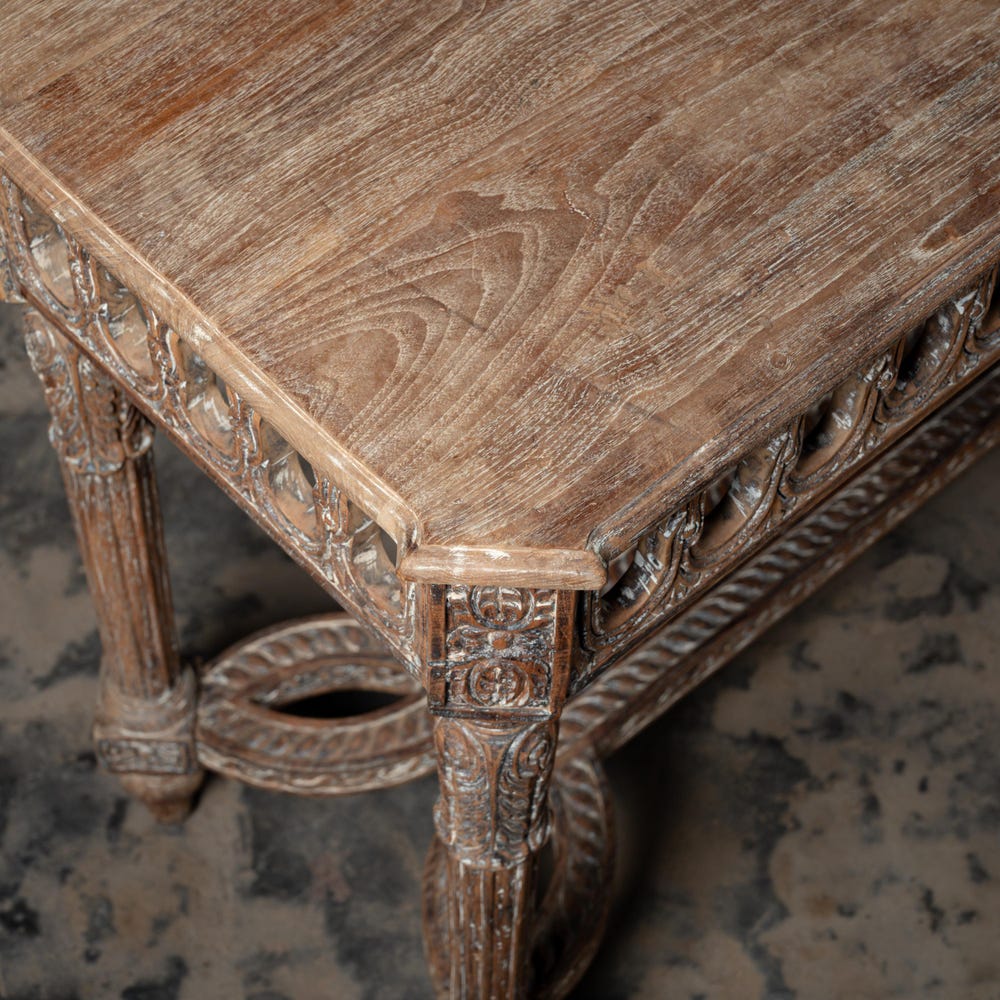 Bring timeless sophistication to your home with the Royal Heritage Carving Console Table, a stunning blend of craftsmanship and heritage design. Hand carved from reclaimed teak wood, this console table boasts intricate details and a classic antique whitewash finish, evoking the charm of regal interiors.