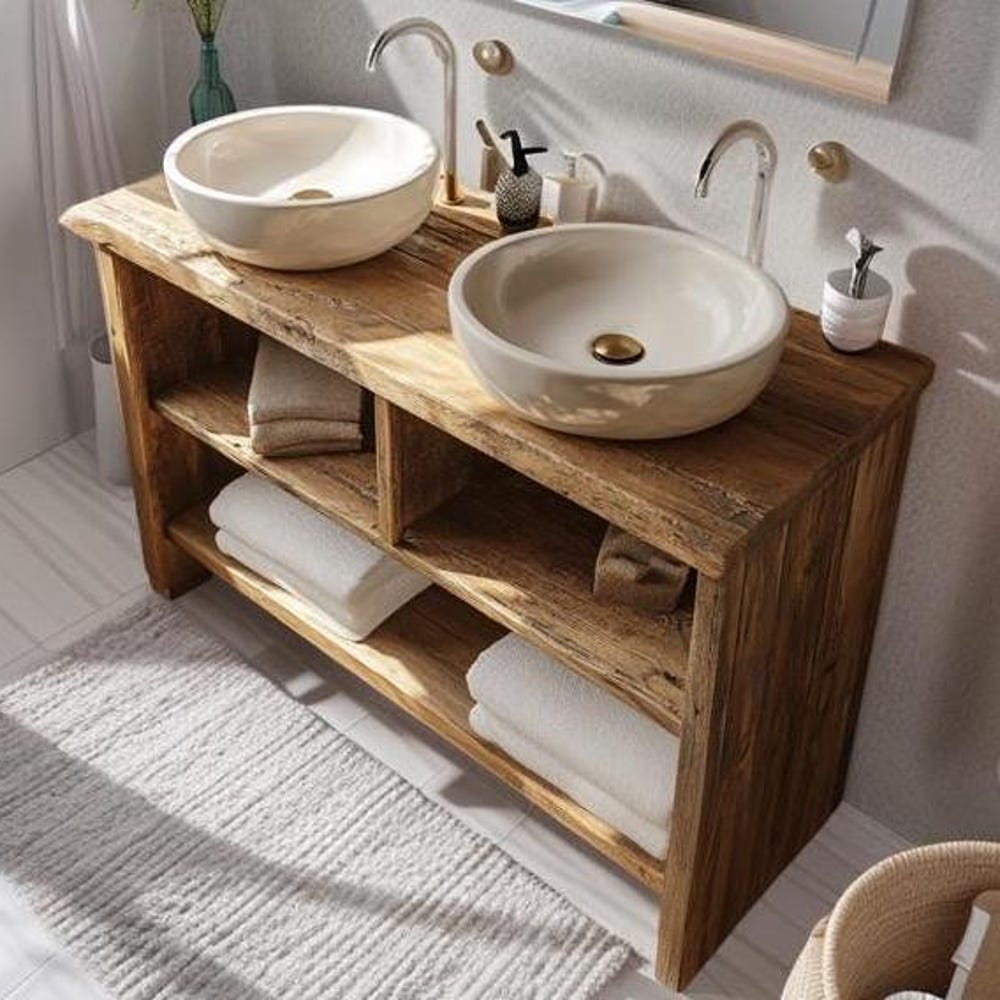 Handcrafted from reclaimed wood with a reclaimed finish, this rustic bathroom vanity adds warmth and character to any space. Designed by skilled artisans, it is fully customizable in size, wood type, and finish. With various stain options, it combines durability, function, and timeless farmhouse style, making it a perfect focal point for your bathroom