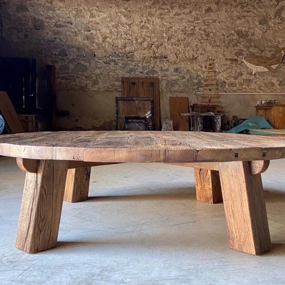 Featuring a unique round coffee table design with beautifully crafted wood table legs, this piece serves as both functional furniture and a decorative statement. Whether placed in the living room or another area of your home, its rustic barnwood charm enhances the ambiance. The table in the photos measures 55” in width and 15” in height, but we also offer custom sizes to fit your space perfectly. This coffee table rustic is ideal for those who love natural materials and timeless craftsmanship.