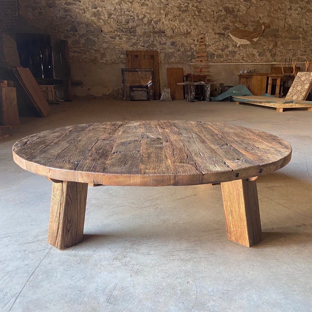 Featuring a unique round coffee table design with beautifully crafted wood table legs, this piece serves as both functional furniture and a decorative statement. Whether placed in the living room or another area of your home, its rustic barnwood charm enhances the ambiance. The table in the photos measures 55” in width and 15” in height, but we also offer custom sizes to fit your space perfectly. This coffee table rustic is ideal for those who love natural materials and timeless craftsmanship.