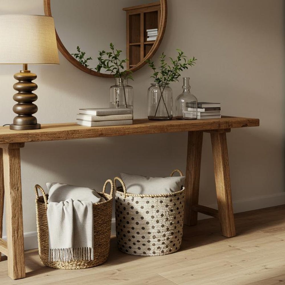 Our rustic console table transforms your entryway with authentic reclaimed wood character. Natural wood grain variations make every table uniquely yours while sturdy construction ensures lasting stability. Available in custom dimensions to suit your space requirements. The perfect blend of rustic charm and practical design for any farmhouse-inspired space.